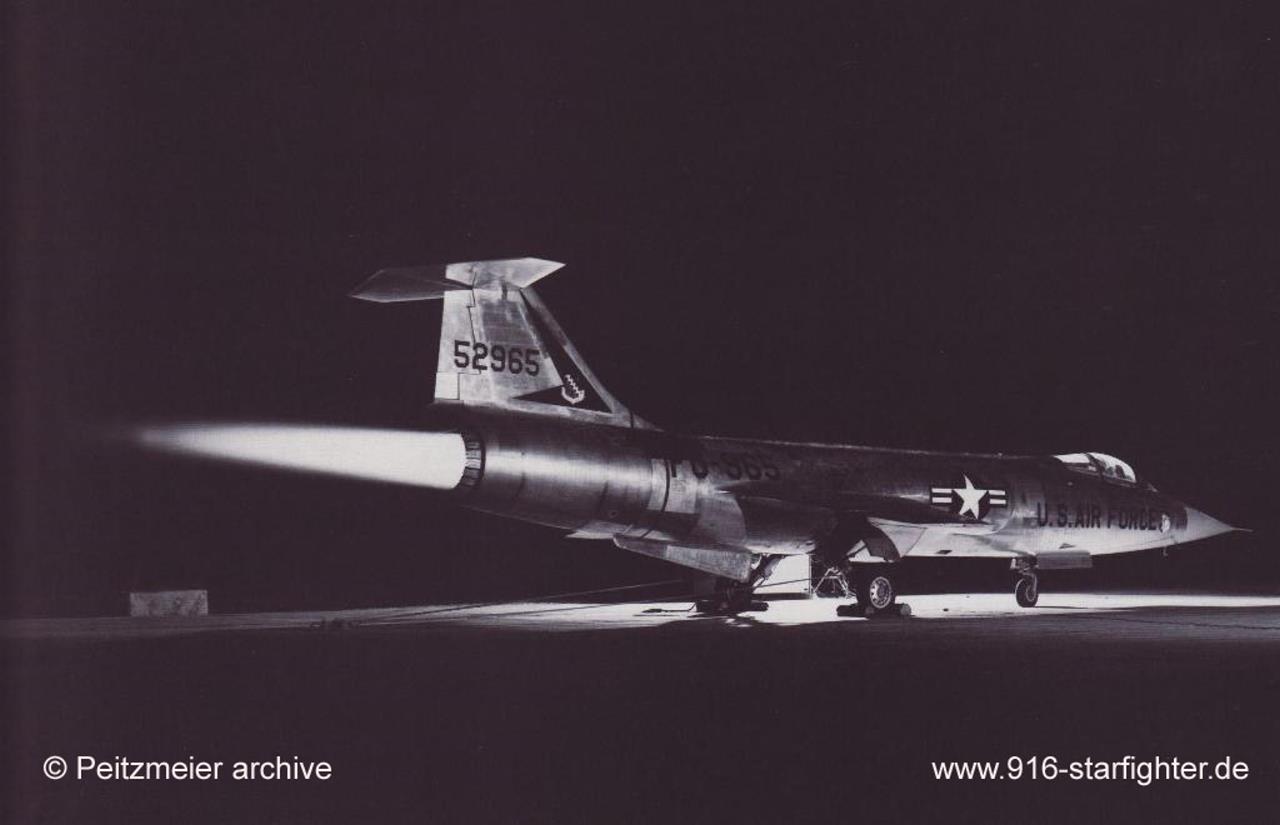 YF-104A 52965 (55-2965) AFFTC during engine test YF-104A, construction number 1011, serial number 55-2965 built by Lockheed ready for delivery July 17, 1956, acceptance by USAF July 31, 1956, delivery date February 4, 1957 ARDC/AFFTC February 1957-November 1964 (US Air Force Flight Test Center, Edwards AFB, (Armament Development and Test Center) 3205th Drone Squadron November 1964-March 1967 coded QFG-965 shot down March 1, 1967 by AIM-4D missile, 5 drone flights. Assigned to the Air Research and Development Command (ARDC) in 1959 JF-104A 55-2965 crash landed on Bicycle Lake, Fort Irwin, 30 NM north of Barstow at 1120 PST on November 16, 1959 after a dead engine landing due to a Fire Warning indication before. Capt George Paul Eremea was performing a functional test flight due to maintenance performed on the afterburner fuel system. Capt George Paul Eremea was not hurt. The aircraft was repaired lateron. copyright © USAF
