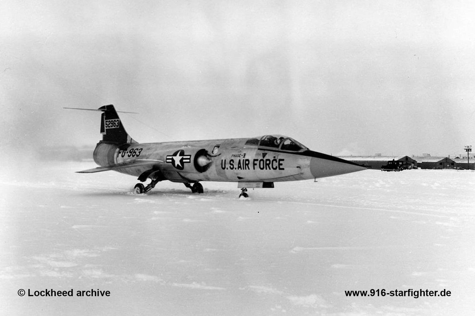 YF-104A 52963 (55-2963) at Elmendorf AFB, Alaska for Cold Weather tests in 1958 YF-104A, construction number 1009, serial number 55-2963 built by Lockheed ready for delivery June 29, 1956, acceptance by USAF June 29, 1956, delivery date September 18, 1956 January 1957 to Wright Air Development Center (Air Research and Development Command), Wright-Patterson AFB, OH (modified to JF-104A), deployments to Lockheed Aircraft, Burbank, and Edwards AFB, CA) cold weather tests at Elmendorf AFB, Alaska with Arctic markings, this intensive testprogram was named "Phase V"; 83 FIS Hamilton AFB, CA September 1961 converted to JQF-104A "QFG-963" with the 3205 DS at Eglin AFB, Florida; shot down on February 1, 1962 by Bomarc G/A missile on 1st drone flight, painted orange overall. copyright © Lockheed archive