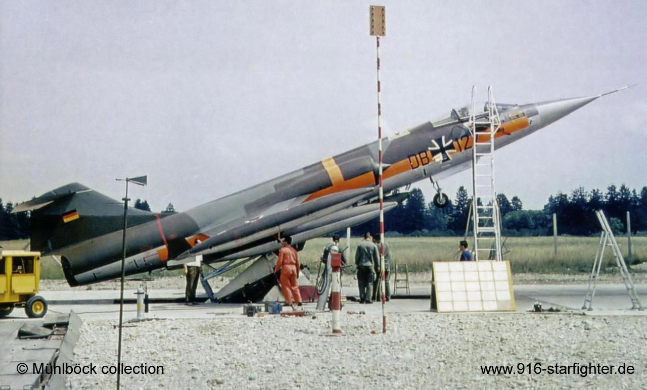 F-104G "DB+127" preparing for a launch with 4 tanks at Lechfeld 1964 F-104G, construction number 683-2002, model 683-10-19, built by Lockheed manufactured by Group USA (ARGE-USA); first flight around November 15, 1960 with register number "102" acceptance date in 1960 by BABwLockheed in Silver-finish colors coded DA+102 for Joint Test Force operation at Palmdale testing basic systems (structure and aerodynamics) in 1961 modified for ZELL (Zero-Length Launch) program at Edwards AFB in 1962; 8 ZELL take-offs at Edwards in 1963 stored at Palmdale with 202 flight hours; shipped to VFW-Lemwerder, Germany on July 28, 1965 for reassembly and modifications camouflage scheme "Norm 62" according tech order "TA-196" in 1966; coded DB+127 accepted on September 14, 1965 by BABwVFW JaboG 32 delivery date on February 24, 1966 for ZELL trials; total of 7 ZELL-trials at Lechfeld AB from May 4, until July 12, 1966 program was canceled due to the changed NATO strategy. copyright © Mühlböck collection