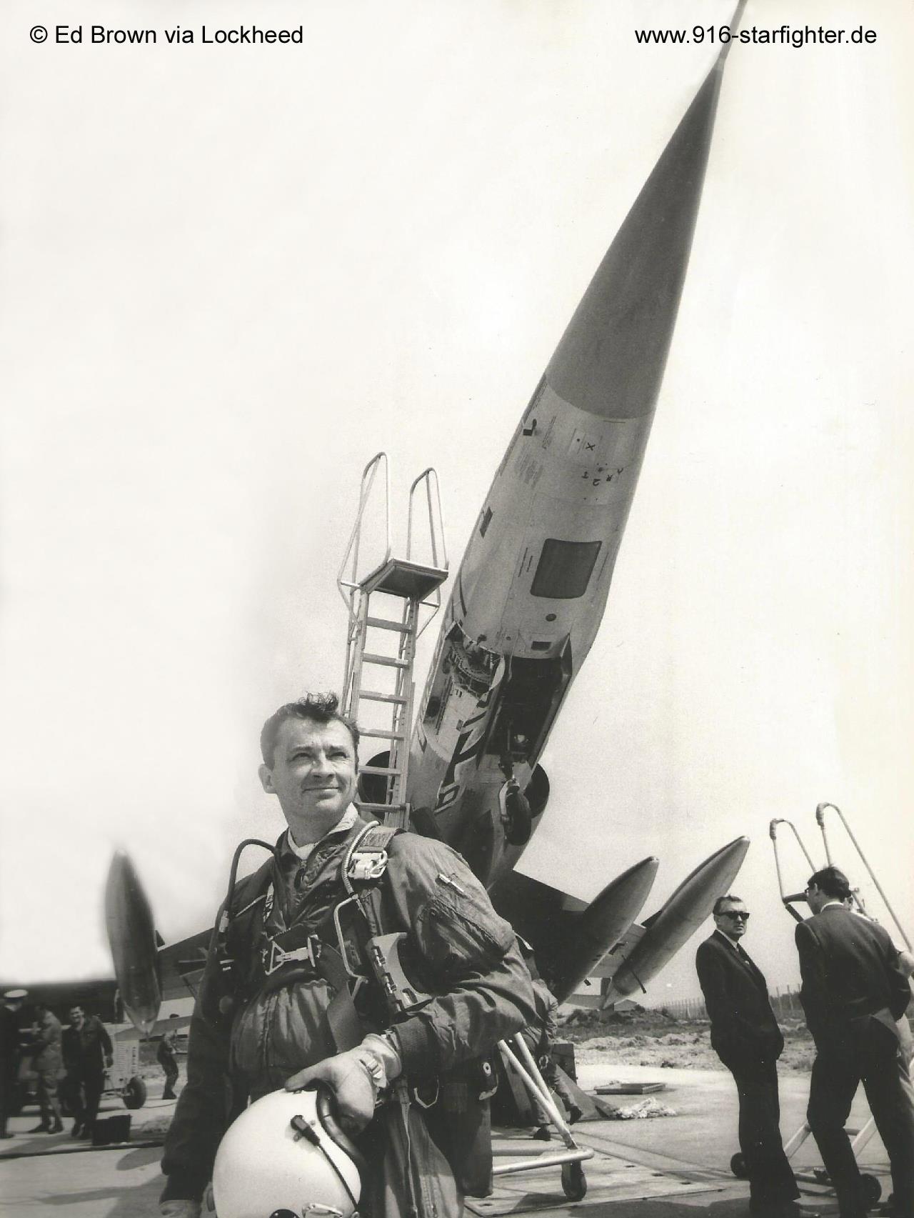 F-104G "DB+127" with test pilot Brown at Lechfeld AB 1966 F-104G, construction number 683-2002, model 683-10-19, built by Lockheed manufactured by Group USA (ARGE-USA); first flight around November 15, 1960 with register number "102" acceptance date in 1960 by BABwLockheed in Silver-finish colors coded DA+102 for Joint Test Force operation at Palmdale testing basic systems (structure and aerodynamics) in 1961 modified for ZELL (Zero-Length Launch) program at Edwards AFB in 1962; 8 ZELL take-offs at Edwards in 1963 stored at Palmdale with 202 flight hours; shipped to VFW-Lemwerder, Germany on July 28, 1965 for reassembly and modifications camouflage scheme "Norm 62" according tech order "TA-196" in 1966; coded DB+127 accepted on September 14, 1965 by BABwVFW JaboG 32 delivery date on February 24, 1966 for ZELL trials; total of 7 ZELL-trials at Lechfeld AB from May 4, until July 12, 1966 program cancelled due to changed of NATO strategy 20+02 re-modified by Messerschmitt; with ErpSt 61 on April 25, 1968; JaboG 32 on January 4, 1971 stored at LwSchleuse 11 on August 6, 1981 with 2.245 flight hours; struck off charge order (AVA) October 2, 1984 on pole LwUGrpKdo Süd Karlsruhe on April 2, 1985; LwWerft 13 Erding on March 8, 1995 for restoration and modification as ZELL aircraft preserved coded "DB+127" at Luftwaffenmuseum der Bundeswehr Berlin-Gatow in ZELL launch configuration on September 12, 1996 February 2009 noted; October 2025 noted.ZELL SATS projects Historical video showing the F-104 ZELL and SATS program. This video has been donated by Devon, daughter of famous ZELL Lockheed test pilot Ed Brown. copyright © Ed Brown