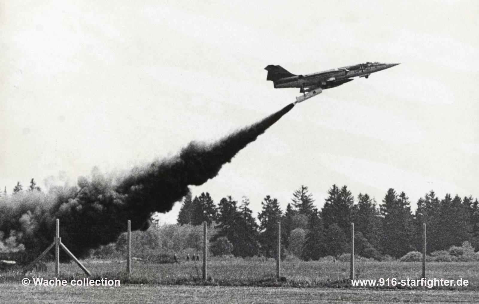 F-104G "DB+127" launch at Lechfeld, loaded with a "special weapon" dummy 1964 F-104G, construction number 683-2002, model 683-10-19, built by Lockheed manufactured by Group USA (ARGE-USA); first flight around November 15, 1960 with register number "102" acceptance date in 1960 by BABwLockheed in Silver-finish colors coded DA+102 for Joint Test Force operation at Palmdale testing basic systems (structure and aerodynamics) in 1961 modified for ZELL (Zero-Length Launch) program at Edwards AFB in 1962; 8 ZELL take-offs at Edwards in 1963 stored at Palmdale with 202 flight hours; shipped to VFW-Lemwerder, Germany on July 28, 1965 for reassembly and modifications camouflage scheme "Norm 62" according tech order "TA-196" in 1966; coded DB+127 accepted on September 14, 1965 by BABwVFW JaboG 32 delivery date on February 24, 1966 for ZELL trials; total of 7 ZELL-trials at Lechfeld AB from May 4, until July 12, 1966, program cancelled due to changed NATO strategy 20+02 re-modified by Messerschmitt; with ErpSt 61 on April 25, 1968; JaboG 32 on January 4, 1971 stored at LwSchleuse 11 on August 6, 1981 with 2.245 flight hours; struck off charge order (AVA) October 2, 1984 on pole LwUGrpKdo Süd Karlsruhe on April 2, 1985; LwWerft 13 Erding on March 8, 1995 for restoration and modification as ZELL aircraft preserved coded "DB+127" at Luftwaffenmuseum der Bundeswehr Berlin-Gatow in ZELL launch configuration on September 12, 1996; February 2009 noted; October 2025 noted. copyright © Wache collection