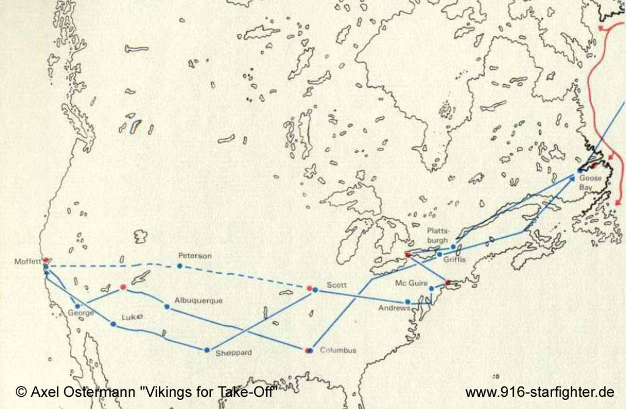 F-104 Starfighter route over the USA "F-104 Farewell" flight in August 1986, when 4 German Navy Starfighter flow all the way to NAS Moffett Field, California copyright © Axel Ostermann "Vikings for Take-Off" Here are the flight legs: Farewell Tour '86 From Eggebek GNB base to RAF Lossiemouth, Scotland to Keflavik, Iceland to Sonderström, Greenland to Goose Bay, Canada (GAF low level training base) to Plattsburg AFB, NY to Andrews AFB, DC to Scott AFB, IL to Sheppard AFB, TX (GAF T-37/T-38 UPT) to Luke AFB, AZ (GAF F-104 training until 1983) to NAS Moffett Field, CA: the target (they made it with 4 Starfighter) airshow celebrating "75 years of Naval Aviation" return via George AFB (GAF F-4 training) to Albuquerque, NM to Columbus AFB; MI to Griffis AFB, NY to Goose Bay again and the rest like on the outbound route.