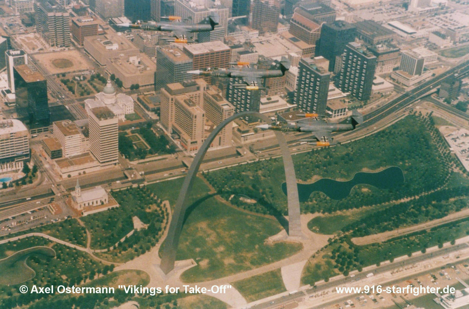 F-104 farewell flight passing over the Gateway Arch in St.Louis "F-104 Farewell" flight in August 1986, when 4 German Navy Starfighter flow all the way to NAS Moffett Field, California to say thanks and good-by for a great time staying in the United States and flying the 104. The photos are from the book by Axel Ostermann, member of the Navy demonstration team the "Vikings". copyright © Axel Ostermann "Vikings for Take-Off"