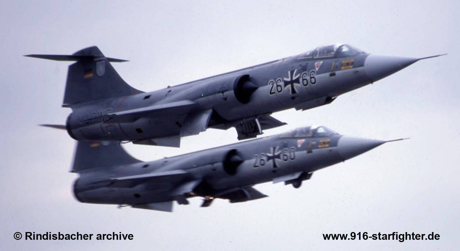 "Vikings" 26+66 extending the gear at the International Air Tattoo (IAT) at RAF Fairford July 1985 F-104G, construction number 7412, company model 683-10-19, built by MBB manufactured by South Group (ARGE-Süd) & VFW; assembly start in Fighterbomber version October 15, 1971 according contract lot 6; first flight December 13, 1971 at MBB-Manching manufactured as attrition replacement aircraft with project "Neptun" as Fighterbomber with "AS.30" and AS.34 "Kormoran" anti-ship missile delivery system for the Marine (German Navy); Navy camouflage scheme "Norm 76" according tech order "TA-196-3" 26+66 MFG 2 at Eggebek AB delivery date on March 24, 1972 July 28, 1982 to Luftwaffenschleuse 11 for AN/ALE-40(N) Chaff/Flare countermeasure dispenser equipment according tech order "TA-1469", back to MFG 2 on September 7, 1982 TechnGrp 11 on January 23, 1986; ErpSt 61 at Manching AB on May 12, 1986 withdrawn from use at LwSchleuse 11 on February 11, 1987 with 2.341 flight hours; struck off charge order (AVA) April 10, 1987; fire tests at WWDBw Munster on March 20, 1987, scrapped. copyright © Rindisbacher archive