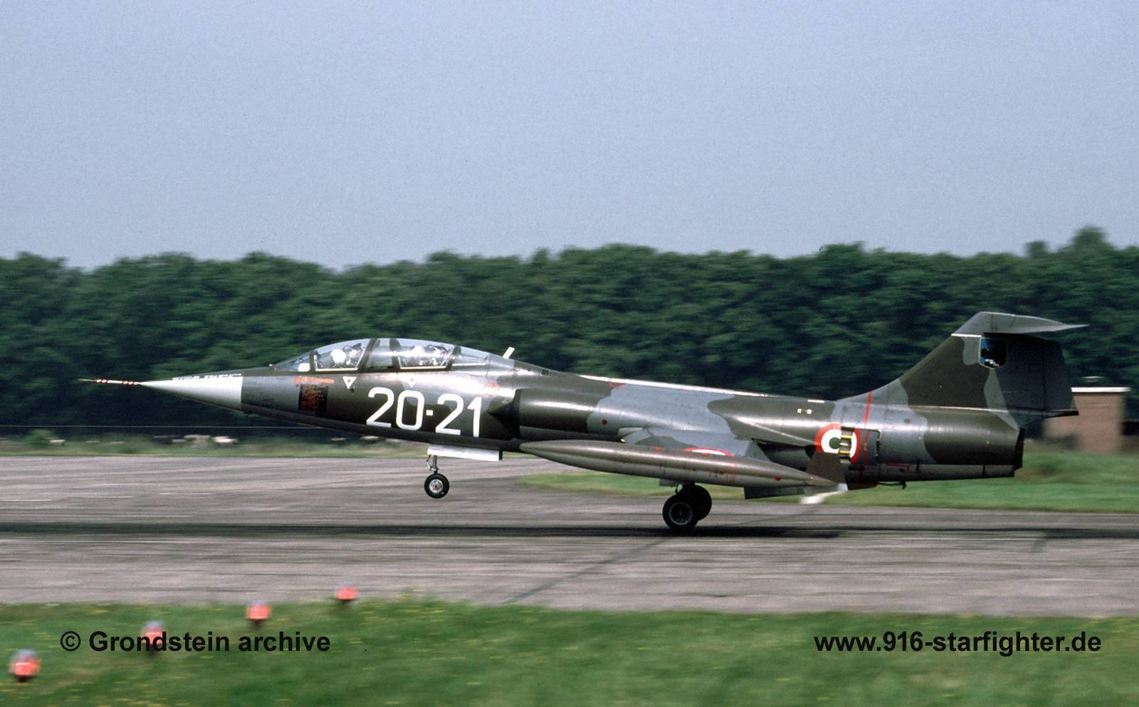 TF-104G "20-21" 20°Gruppo in early camouflage scheme at Twenthe AB in August 1984 TF-104G, construction number 583H-5207, model 583-10-20, serial number MM54256, reassembled by FIATmanufactured by Lockheed at Palmdale, California; airlifted to Turin; reassembled and delivered to AMI delivery date AMI 22.10.1969; 20-21 20°Gruppo 4.11.1975-10.8.1984; IRAN 21.9.1978-1.6.1979; IRAN 9.11.1982-4.10.1983 IRAN till 11.7.1985; delivery date 20°Gruppo 11.7.1985, 4-38 05.1985-20.6.1995; IRAN 31.7.1987-23.12.1988 IRAN 3.11.1992-27.4.1995; gear collapsed on landing at EDNN on May 19, 1995 after hitting approach lights, repaired crashed coded 4-38 of 20°Gruppo on June 20, 1995 into sea south of the Montechristo island in misty weather conditions, pilot was killed. copyright © Grondstein archive