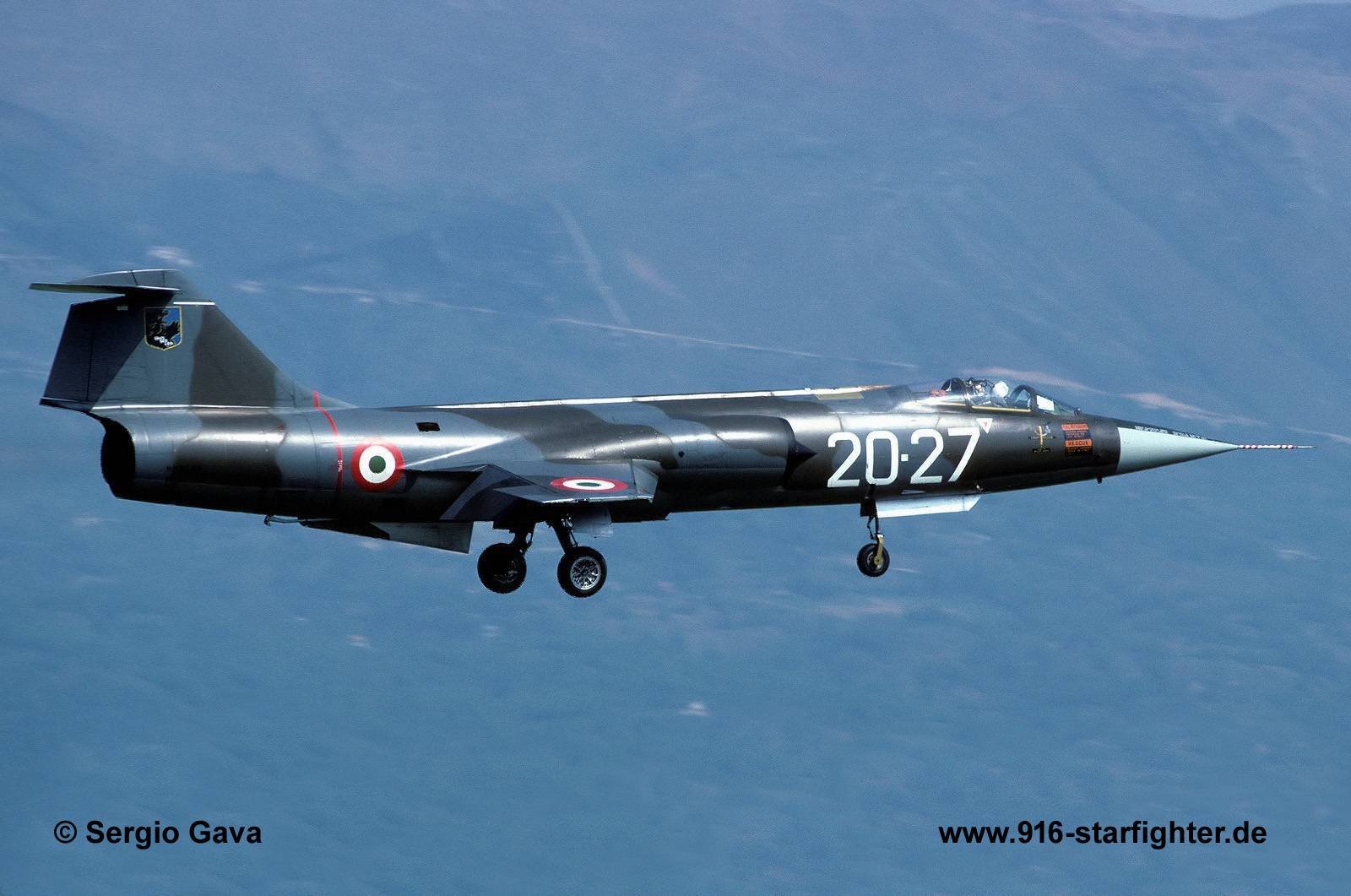 F-104G "20-27" MM6598 of 20°Gruppo landing at Aviano AB 1980 with large code numbers in June 1980 F-104G, serial number MM6598, construction number 683D-6598, model 683-10-19, built by FIATdelivery date AMI 8.8.1964; delivery date 102°Gruppo 1.9.1964, 5-?? 09.1964-20.2.1968; IRAN 20.2.1968-25.9.1968; delivery date 154°Gruppo 25.9.1968, 6-12 154 Gruppo CBOS 6 Stormo Ghedi AB, damaged Aviano 8.9.1971 after collision with MM6536 and MM6560; IRAN 28.9.1971-3.3.1972; delivery date 10°Gruppo 3.3.1972, 9-03 X Gruppo Caccia Intercettori Ognitempo 9 Stormo "Francesco Baracca" 03.1972-21.9.1972; delivery date Villafranca 21.9.1972, 3-?? till 17.7.1975; IRAN 17.7.1975 delivery date 3°AB 1976, 3-34 28 Gruppo CRO 3 Stormo "Carlo Emanuele Buscaglia" 06.1976-3.10.1976; 3-37 04.1977-23.9.1977; 3-07 132 Gruppo CRO 3 Stormo 6.11.1977-20.4.1978 IRAN till 22.3.1979; 3-41 28 Gruppo CRO 3 Stormo 14.4.1979; delivery date 20°Gruppo Autonomo Addestramento Operativo 11.3.1980, 20-27 18.4.1980-25.4.1983 delivery date Villafranca 15.2.1984, stored 20.2.1984-7.9.1985; IRAN 15.10.1985-5.8.1986 delivery date 132°Gruppo CRO 3 Stormo "Carlo Emanuele Buscaglia" 5.8.1986, 3-12 27.8.1986-12.1989 withdrawn from use 3.5.1990, destroyed for CFE 07.1994; Villafranca dump 31.7.1997-23.7.1998; tail & wings stored San Possidonio 17.4.99-2000 stored at Polytechnic Institute at Lungaville north of Voghera 2000-07.2012; MM6598, with tail from FX02, nose radome of MM6931 being restored at Vigolzone, close to Piacenza April 25, 2013 fist noted; July 2024 noted. copyright © Sergio Gava