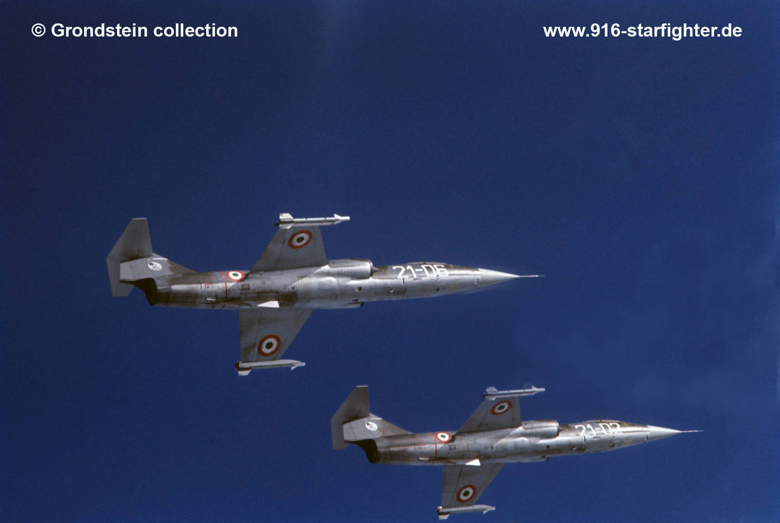 F-104G "21-02" 21°Gruppo (Gruppo Autonomo) 1966 F-104G, construction number 683D-6543, model 683-10-19, serial number MM6543, built by FIATdelivery date AMI 27.11.1963; delivery date 21°Gruppo 29.11.1963, 51-02 12.1963-09.1964, 21-02 21°Gruppo Autonomo Caccia Ogni Tempo 21 06.1966-25.11.1966 21.06.1966 till 29.06.21 Gruppo Autonomo from Cameri exchanged with 322 Squadron from Leeuwarden AB, Netherlands; IRAN 25.11.1966-18.5.1967 delivery date 102°Gruppo 18.5.1967, 5-16 102°Gruppo (unknown); 4-15 in 1969 5-09 102°Gruppo CB from Rimini, Miramare crashed June 2, 1969 after midair collision with MM6581 near Morciano di Romagna during practice flight for parade "La Festa della Republica" the pilot was killed; 933 flight hours. copyright @ Grondstein collection