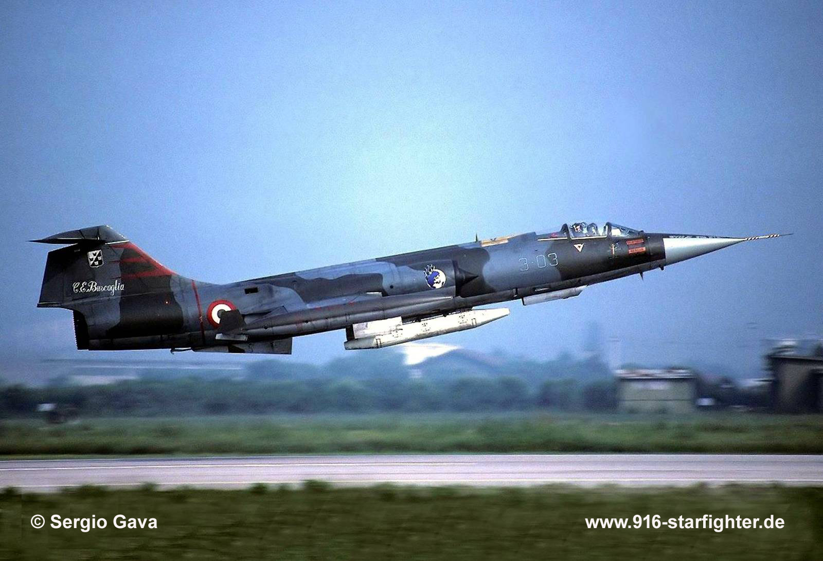 F-104G "3-03" MM6611 132°Gruppo of 3°Stormo departing Villafranca AB in January 1990 F-104G, construction number 683D-6611, model 683-10-19, serial number MM6611, built by FIAT at Turin Caselledelivery date AMI 11.12.1964; delivery date 102°Gruppo 15.4.1967, 5-?? 04.1967-17.6.1968; to IRAN 17.6.1968; IRAN till 31.8.1972 delivery date 154°Gruppo of 6 Stormo 31.8.1972, 6-?? 12.1972-9.6.1975; IRAN 9.6.1975-24.8.1976; delivery date 28°Gruppo 24.8.1976, 3-35 08.1976-3.10.1976 3-18 04.1977-1.3.1978; 3-15 132 Gruppo Caccia Ricognitori 3 Stormo 4.4.1978-1.8.1979; IRAN 19.11.1979-3.7.1980 delivery date 28°Gruppo Caccia Ricognitori Ognitempo 3 Stormo "Carlo Emanuele Buscaglia" 3.7.1980, 3-33 03.1981-03.1984, stored Villafranca 10.6.1984-10.6.1986 IRAN 10.6.1986-21.6.1988; delivery date 132°Gruppo 21.6.1988, 3-03 08.1988-30.9.1989; 3-52 9.7.1991-11.11.1991, delivery date 20°Gruppo 11.11.1991 withdrawn from use Grosseto June.13,1992 with 3.689 flight hours; 3-52 at Roma-Centocelle Gate Guard Comando 2°Regione Aerea October 1, 1993 later removed there (replaced by MM6916) and after refurbishing MM6611 was erected at Poggio on July 1, 1998 preserved "4-21" Poggio Ballone (near Grosseto AB) (GR) July 1, 1998 January 22, 2010 noted; September 2021 noted (Base Radar 21° GRAM-Gruppo Radar Aeronautica Militare); September 2023 noted.
