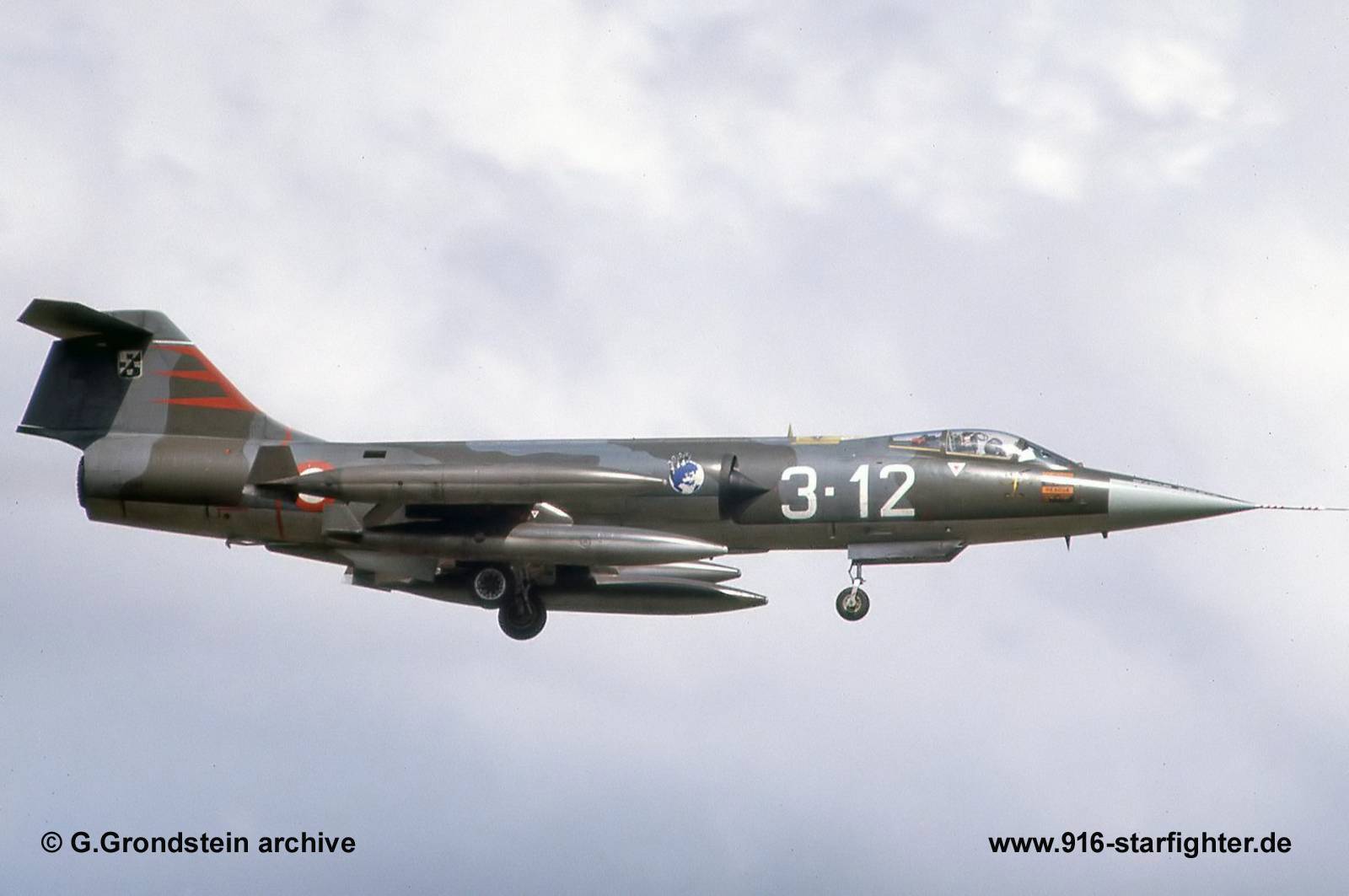 F-104G "3-12" MM6586 132°Gruppo landing at Eindhoven AB, Netherlands in May 1984 F-104G, construction number 683D-6586, serial number MM6586, model 683-10-19, built by FIATdelivery date AMI 19.6.1964; delivery date 102°Gruppo of 5 Aerobrigata 23.6.1964, 5-? 06.1964-9.4.1968; IRAN 9.4.1968-21.10.1968 delivery date 154°Gruppo of 6°Stormo 21.10.1968, 6-?? 11.1968-18.3.1971; IRAN 18.3.1971-29.10.1971; delivery date 10°Gruppo of 9°Stormo 29.10.1971, 9-24 11.1971-16.5.1973 delivery date 20°Gruppo 16.5.1973, 20-27 11.7.1973-10.4.1974; IRAN 10.4.1974-20.12.1974; delivery date 132°Gruppo of 3°Aerobrigata 20.12.1974, 3-03 8.7.1976-20.4.1978 Orpheus pod modification at Aeritalia 8.3.1977-5.5.1977; IRAN 2.12.1977-10.4.1979; delivery date 132°Gruppo of 3°Stormo 10.4.1979, 3-05 05.1980-01.1982 delivery date 28°Gruppo (on loan) 02.1982, 3-46 16.5.1982-9.10.1982; IRAN 7.9.1982-16.6.1983; delivery date 132°Gruppo at Villafranca 16.6.1983, 3-12 8.5.1984-08.1986 crashed, carrying an Orpheus pod, after altitude loss due to APC failure with "kicker" (pusher) problems on August 4, 1986 at Bernbach, near Bad Herrenalb, Germany during a squadron exchange of 132°Gruppo with USAFE 38th TRS of 26 TRW, flying the RF-4C Phantom from Zweibrucken, Germany, pilot ejected safely; 3.148 flight hours. copyright © G.Grondstein archive