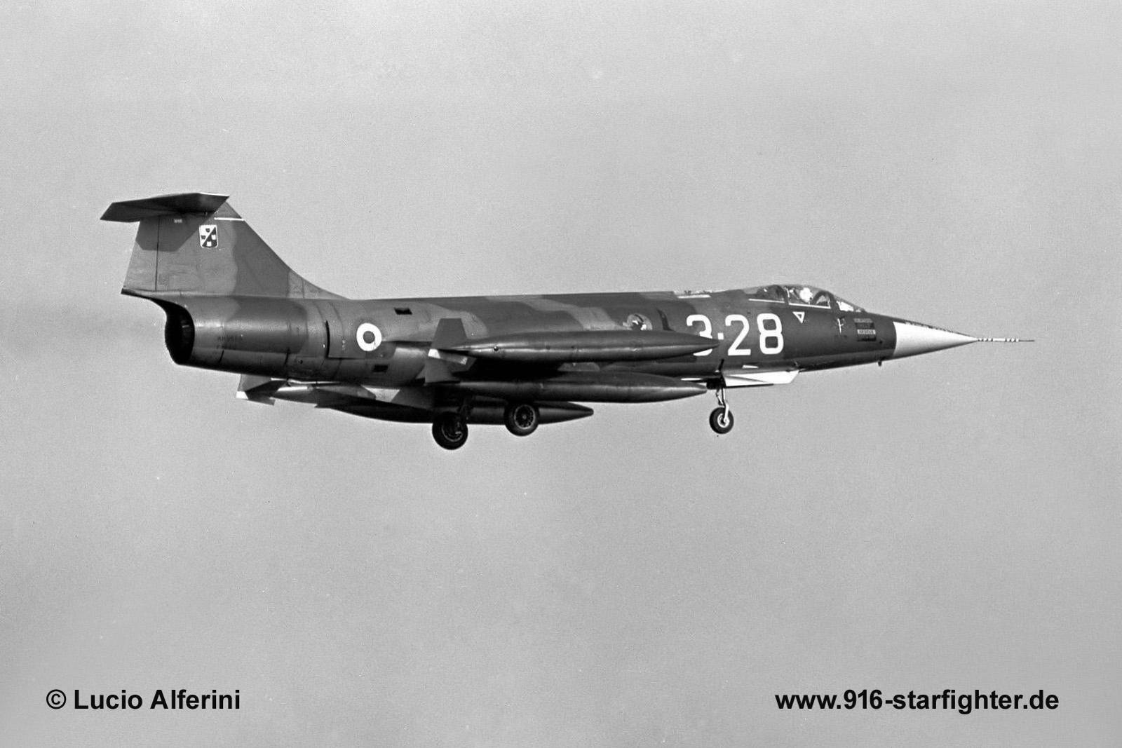 RF-104G "3-28" 28°Gruppo of 3°Stormo "Carlo Emanuele Buscaglia" from Villafranca in 1976 F-104G, construction number 683D-6643, serial number MM6643, model 683-10-19, built by FIATdelivery date AMI 14.6.1965; delivery date 101 Gruppo 21.6.1965, 5-?? 07.1965-03.1966; delivery date 102 Gruppo 14.3.1966, 5-?? 03.1966-12.6.1967 delivery date 10 Gruppo 12.6.1967, 9-?? 06.1967-17.7.1968; IRAN 12.7.1968-27.3.1969; delivery date 9 Gruppo 27.3.1969, 4-? till 31.7.1970; FIAT for repair delivery date 28 Gruppo 12.10.1970, 3-21 25.10.1971-3.12.1971; IRAN 30.10.1972-18.10.1973; delivery date 28 Gruppo 18.10.1973, 3-28 10.1973-26.8.1974 3-21 7.8.1975; 3-28 2.9.1975-14.2.1977; IRAN 14.2.1977-6.3.1978; delivery date 28 Gruppo 6.3.1978, 3-37 4.4.1978-10.4.1979; 3-22 05.1980; IRAN 3.4.1981-16.6.1982 delivery date 132 Gruppo 16.6.1982, 3-27 10.1982-06.1986; IRAN 22.7.1986-4.8.1987; delivery date 132 Gruppo 4.8.1987, 3-24 10.1988; 3-31 27.6.1990 withdrawn from use Villafranca 24.7.1991 with 3.681 flight hours; CFE in 1995; Villafranca dump 31.7.1997-07.2003 dump (tail/fuselage separated) Villafranca January 2014 last noted; scrapped. copyright © Lucio Alferini