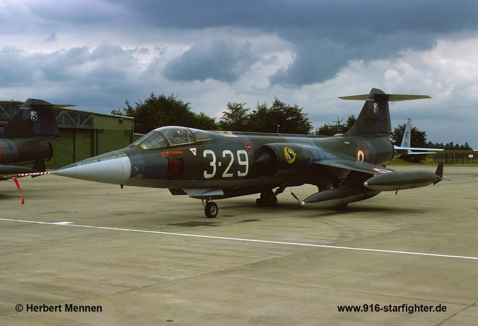 RF-104G "3-29" 28 Gruppo of 3 Stormo at RAFG Wildenrath July 14, 1977 RF-104G, construction number 683D-6649, model 683-04-10, serial number MM6649, built by FIATdelivery date AMI 18.5.1965; delivery date 101°Gruppo 22.6.1965; delivery date 154°Gruppo 8.7.1966; delivery date 21°Gruppo 17.4.1967, 21-21; 1. IRAN 20.6.1967-28.12.1967 delivery date 154°Gruppo 28.12.1967; delivery date 9°Gruppo 27.3.1969; 2.IRAN 28.4.1970-7.1.1971; delivery date 28°Gruppo CRO 3 Aerobrigata CR 7.1.1971, 3-28 11.1.1971-5.11.1973 3. IRAN 18.10.1973-23.8.1974; delivery date 28°Gruppo 23.8.1974, 3-28 18.10.1974(?); 3-29 15.6.1976-23.8.1977; 4. IRAN 23.8.1977-23.5.1978 delivery date 28°Gruppo Caccia Ricognitori Ognitempo 3 Stormo 23.5.1978, 3-32 11.1978; 3-23 05.1980; 3-31 08.1981; 5. IRAN 27.10.1982-19.9.1983 delivery date 28°Gruppo 19.9.1983, 3-31 October 1983 28 Gruppo "30,000 ore" on tip tanks, blue highlights marks; 6. IRAN 24.2.1987-5.10.1988 delivery date 3°Stormo 5.10.1988, 3-31 18.8.1987-09.1989; coded 3-24 in October 1988; delivery date 20°Gruppo 9.10.1989 4-49 20 Gruppo Addestramento Operativo 4 Stormo 15.6.1991-16.9.1992, last flight to Trapani AB; withdrawn from use with 3.572 flight hours dump Trapani 24.9.1995-4.12.1997, dump Amendola AB 12.11.1998-5.12.1999; Bentivoglio scrapyard 09.2001 preserved airstrip Acquarossa di Bastardo (PG) 03.2003; January 2014 noted; April 2022 noted.