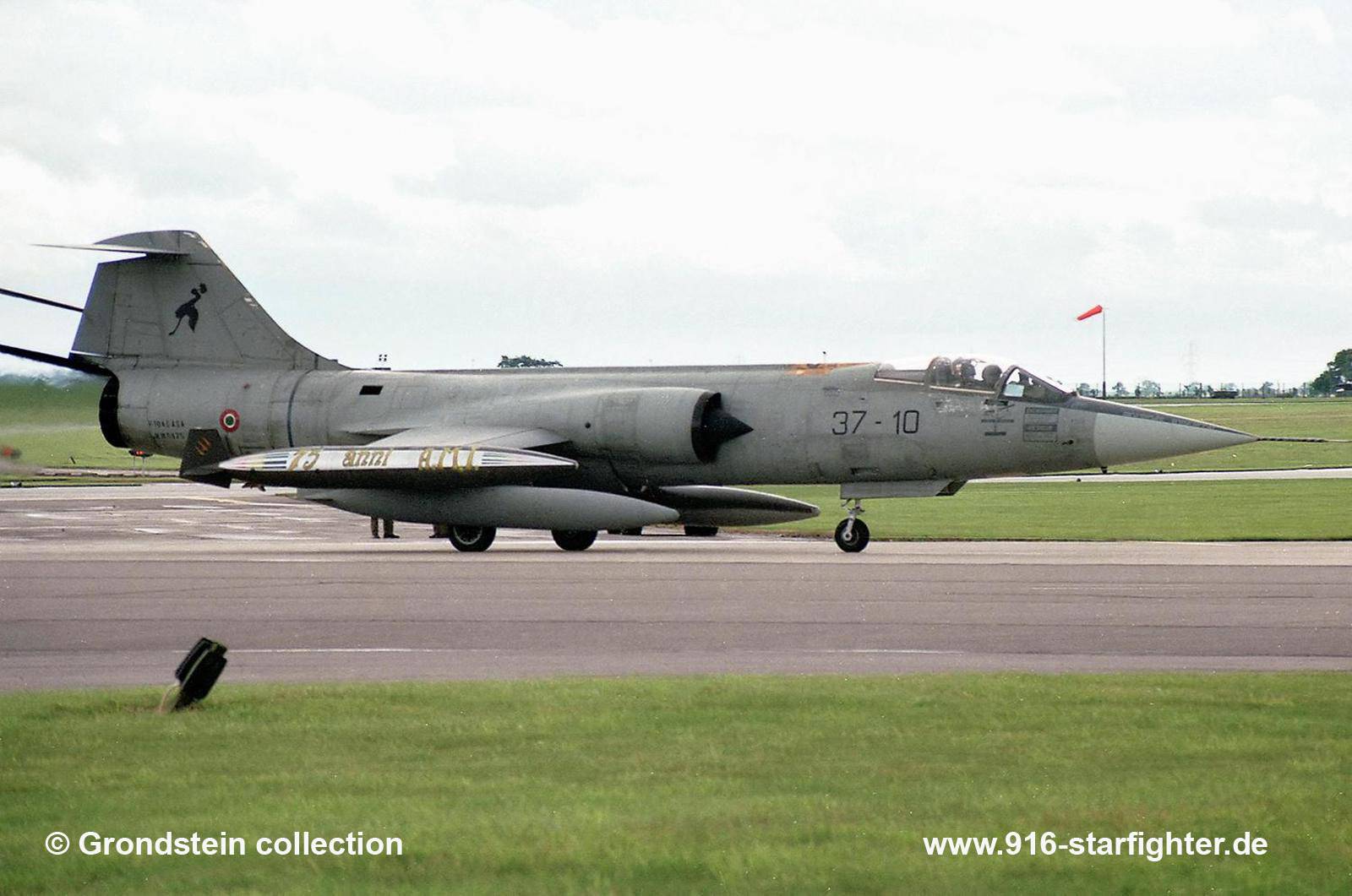 F-104S.ASA "37-10" 18°Gruppo of 37°Stormo "75.anni AMI" from Trapani AB at RAF Waddington Airshow June 1998 F-104S, construction number 783-1125, serial number MM6825, model 783, built by Aeritaliabuilt by Aeritalia; delivery date AMI 26.10.1973; delivery date 10°Gruppo CIO 9°Stormo "Francesco Baracca" Grazzanise AB 27.10.1973, 9-42 9.11.1973-16.2.1977 IRAN 16.12.1977-15.2.1979; delivery date 21°Gruppo CIO 53°Stormo "Guglielmo Chiarini" Cameri AB 15.2.1979, 53-20 23.4.1979-14.9.1983; IRAN 14.9.1983-1.6.1984 delivery date 21°Gruppo 6.6.1984, 53-06 18.8.1984-10.3.1988, on load 22°Gruppo 10.3.1988-1.4.1988 53-06 "Tiger" at Cameri 1988 fot the Tiger Meet 1988, special tiger colors 7.7.1988; 53-05 16.7.1988-30.9.1988. IRAN + F-104S.ASA conversion by Aeritalia 30.9.1988-7.3.1990 delivery date XII Gruppo CIO 36 Stormo Gioia del Colle AB 14.3.1990, 36-11 24.3.1990-15.7.1994; IRAN 15.7.1994-10.7.1996; grey camouflage scheme delivery date 18°Gruppo 37 Stormo "Cesare Toschi" Birgi AB 19.7.1996, 37-10 5.8.1997-15.5.2000; 37-10 at Leuchars St. Andrews Battle of Britain Airshow September 12, 1997 delivery date 9°Gruppo 4 Stormo Grosseto AB 22.4.2000, 4-21 6.9.2000-10.11.2000 withdrawn from use Grosseto with 4.180 flight hours 30.11.2000, dump CFE 4 Reparto Manutenzione Velivoli (RMV) without wings with tail of MM6805 8.12.2000 stored Grazzanise AB April 2009 last noted; scrapped. copyright @ Grondstein collection
