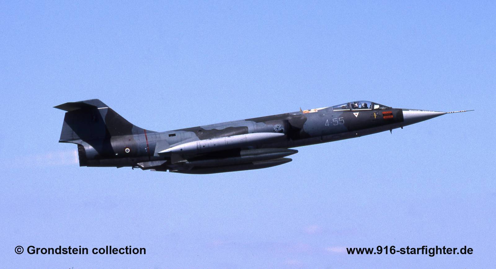 F-104S.ASA "4-55" 20°Gruppo AMI in old green camouflage scheme during take-off at RAF Fairford 1999 F-104S, construction number 783-1117, serial number MM6817, model 783, built by Aeritaliadelivery date AMI 14/5/73; d/d 10° Gruppo 29.5.1973, 9-34 06.1973-29.3.1976; delivery date 23°Gruppo 29.3.1976, 5-36 04.1976-14.9.1977; IRAN 16.6.1978 delivery date 12° Gruppo 29.6.1978, 36-11 06.1978-29.7.1982; IRAN 31.3.1983-5.12.1983; delivery date 10° Gruppo 20.12.1983, 9-45 01.1984-16.12.1987 IRAN + F-104S.ASA conversion 16.12.1987-25.2.1989; delivery date 10°Gruppo 9.3.1989, 9-40 18.5.1989-12.11.1992; IRAN 13.11.1992-21.2.1995 delivery date 22°Gruppo 8.3.1995; 51-02 03.1995-19.10.1998; delivery date 20°Gruppo 19.10.1998, 4-55 19.4.1999-29.10.1999; last flight 20.121999 withdrawn from use with 3805 flight hours; dump Grosseto 25.1.2000-10.4.2001, CFE at Cervia 19.3.2002; Grosseto dump 17.7.2003-12.12.2003 restoration by the 4th RMV at Grosseto 24.2.2004-26.5.2004; preserved with a beer-house restaurant at Castello di Godego as "51-07" with 22 Gruppo marks from June 14, 2004 May 28, 2009 noted; November 2022 noted.