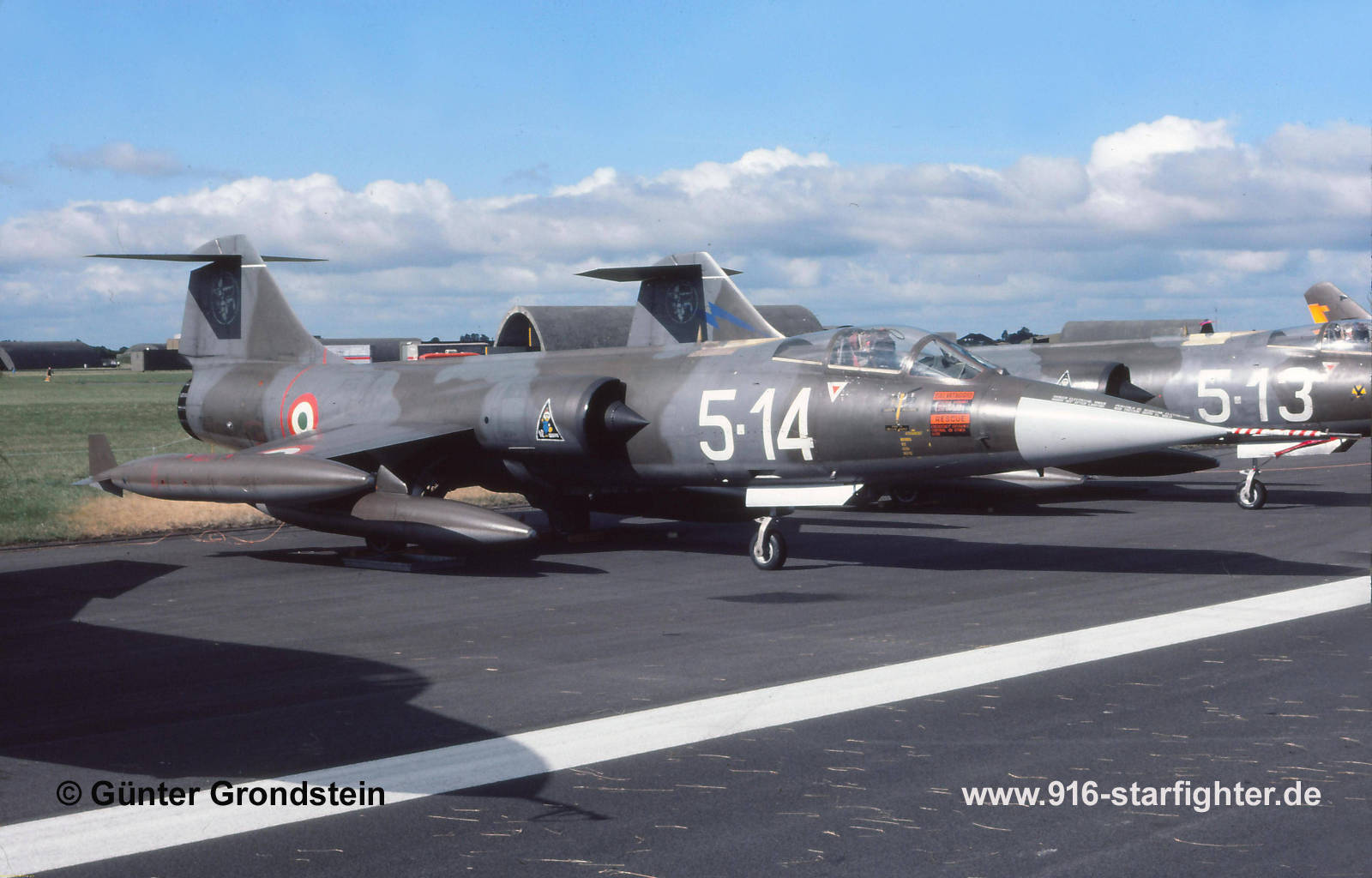 F-104S "5-14" 102°Gruppo of 5°Stormo at Schleswig-Jagel AB in July 1985 F-104S, construction number 783-1059, serial number MM6759, model 783, built by Aeritaliadelivery date AMI 23.12.1971; 36-47 36 Stormo 156 Gruppo; 36-48 10.9.1973-4.11.1975; IRAN till 7.1.1977 September 1975 squadron exchange between the Dutch Air Force 316 Squadron based at Gilze Rijen, flying the NF-5A and the Italian Air Force 156 Gruppo based at Gioia Del Colle IRAN till 7.1.1977; delivery date 156 Gruppo 20.1.1977, 36-34 04.1978-8.7.1980; IRAN 8.7.1980-1.3.1981; delivery date 156°Gruppo 8.4.1981, 36-34 16.7.1981-5.1.1984 delivery date 102 Gruppo of 5 Stormo 5.1.1984, 5-14 05.1984-1.9.1985; IRAN 24.9.1985-16.6.1986; delivery date 102 Gruppo 16.6.1986, 5-24 08.1986-26.6.1990 IRAN+F-104S.ASA conversion 10.10.1990-30.6.1992; delivery date 102 Gruppo 6.7.1992; 5-03 09.1992-8.4.1993; delivery date 18 Gruppo 37 Stormo 30.4.1993, 37-26 8.9.1993-17.1.1996 Ample Train at Örland AB, Norway June 1995; IRAN+F-104S.ASA-M conversion 17.1.1996-4.12.1997, grey camouflage scheme delivery date 23 Gruppo of 5 Stormo 18.12.1997; 5-45 30.2.1998-27.7.1998; delivery date 18 Gruppo 11.8.1998, 37-20 28.8.1998-3.12.2001 for Operation Allied Force deployed to Amendola AB in February 1999; withdrawn from use in March 2003 with 4.681 flight hours; dump Trapani 11.3.2003 dump Grazzanise 10.10.2005-4.6.2010 CFE plate of MM6749; scrapped. copyright © Günter Grondstein