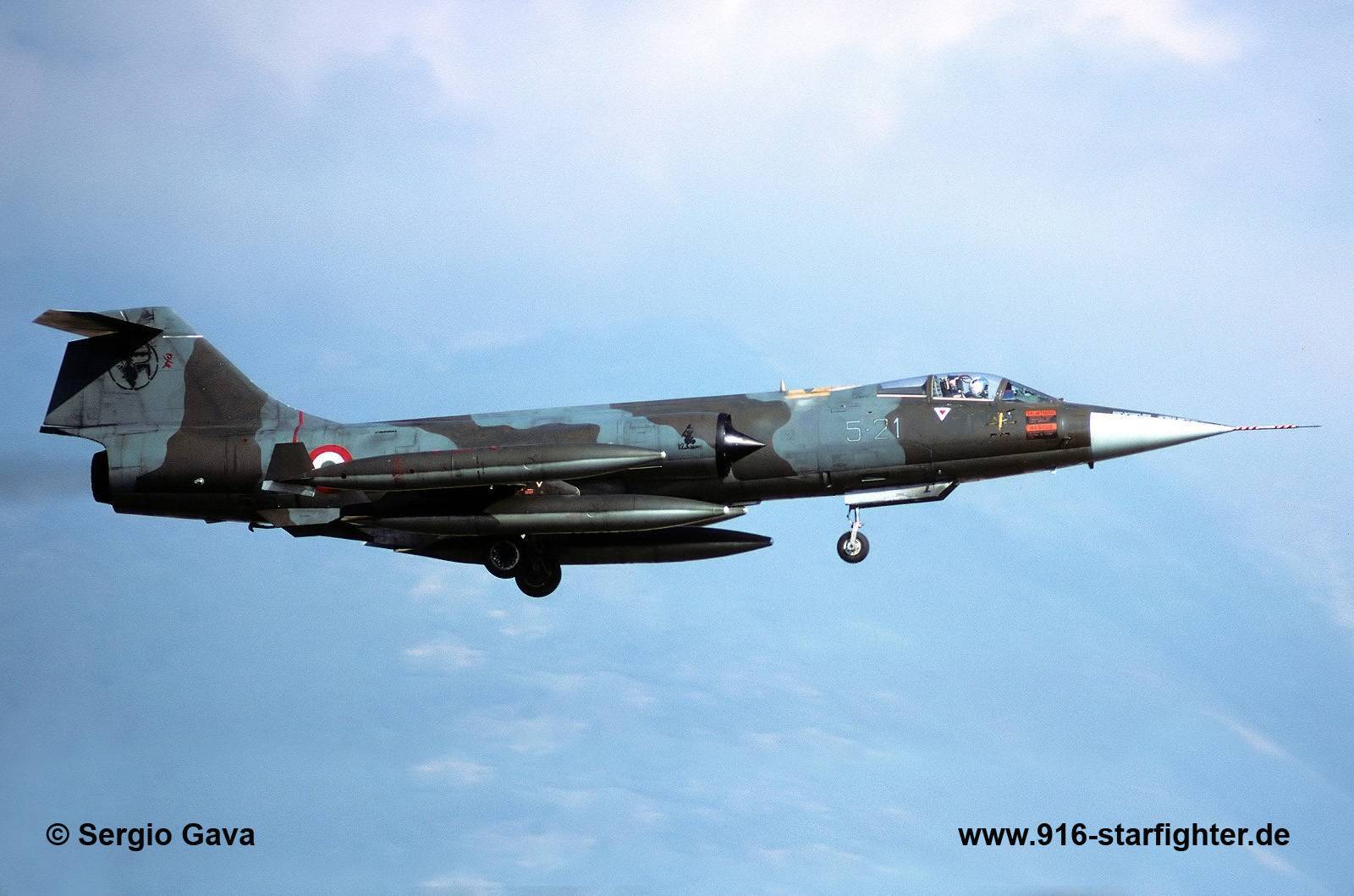 "5-21" MM6784 F-104S.ASA 102 Gruppo 5 Stormo arrival for exercise "Dragon Hammer" at Aviano May 20, 1991 F-104S, construction number 783-1084, serial number MM6784, model 783, built by Aeritaliadelivery date AMI 15.6.1972; delivery date 155°Gruppo 30.6.1972, 50-04 31.3.1973-12.10.1973; delivery date 51°Stormo 12.10.1973, 51-34 12.1973-9.7.1976 IRAN 9.7.1976-25.5.1977; delivery date 156°Gruppo 10.6.1977, 36-43 08.1977-13.6.1980; 5-37 11.1983-9.6.1984; IRAN + F-104S.ASA conversion 10.12.1985-21.9.1987 delivery date 102°Gruppo 1.10.1987, 5-21 07.1988-20.5.1991; IRAN 21.1.1992-25.6.1993; delivery date 18°Gruppo 7.7.1993, 37-27 3.9.1993-26.8.1997 withdrawn from use 24.1.1997 with 3.199 flight hours; dump Grosseto 30.4.1998-24.2.2004 Grazzanise dump 10.5.2004 no tail, camouflage scheme; stored on CFE-dump, no further information; scrapped. copyright @ Segio Gava