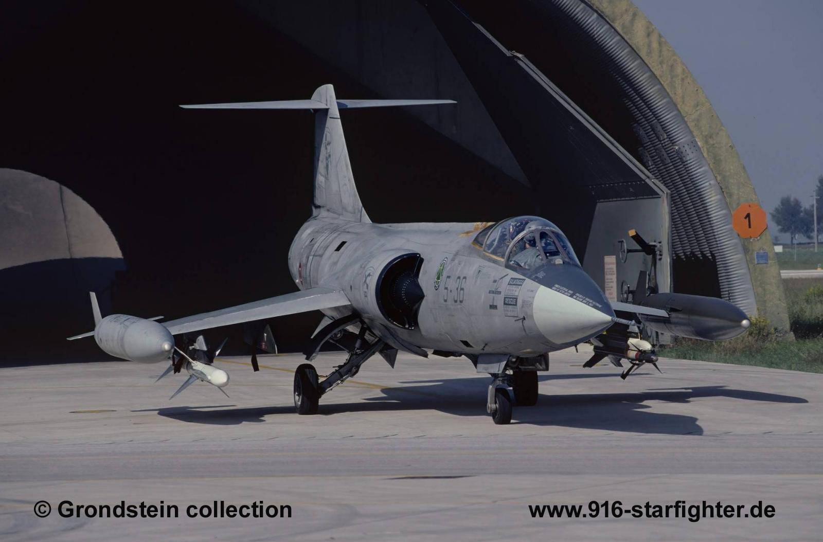 F-104S ASA-M "5-36" 23°Gruppo of 5°Stormo 1998 fully armed for an Air Defence mission F-104S, construction number 783-1180, serial number MM6880, model 783, built by Aeritaliadelivery date AMI 18.11.1975; delivery date 23°Gruppo 20.11.1975, 5-42 01.1976-12.1979; IRAN 12.12.1979-2.9.1980; delivery date 21°Gruppo 5.9.1980, 53-07 02.1982-08.1983 damaged on takeoff Cameri 21.9.1983; 5-42 08.1984-04.1985; IRAN 12.6.1985-20.3.1986; delivery date 9°Gruppo 8.4.1986, 4-21 06.1986-2.11.1988 delivery date 21°Gruppo 2.11.1988, 53-05 12.1988-26.7.1989; IRAN + F-104S ASA conversion 26.7.1989-2.7.1991; delivery date 9°Gruppo 12.7.1991, 4-12 08.1991-30.10.1995 IRAN + F-104S ASA-M conversion 30.10.1995-23.12.1997; grey camouflage scheme; delivery date 23°Gruppo 30.12.1997; 5-36 28.2.1998-03.2002 last flight 21.8.2001 with 3954 flight hours; (1. ASA-M reaching service life); withdrawn from use Cervia 22.12.2001-13.1.2003; Cervia AB CFE cut-up July 26.2002 preserved on pole at Cervia 15.9.2003 as gate guard coded 5-36 with 4 tanks 2003; September 2025 as Gate Guard noted.