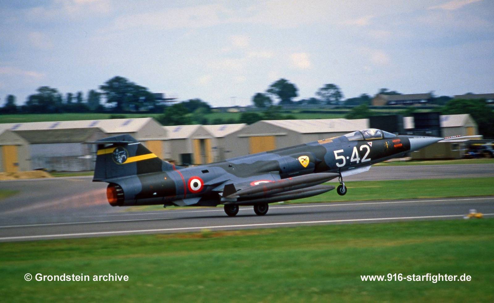 F-104S "5-42" 23°Gruppo of 5°Stormo Aeronautica Militare Italiana (Italian Air Force) at RAF Fairford 1985 F-104S, construction number 783-1114, serial number MM6814, model 783, built by Aeritaliadelivery date AMI 13.4.1973; delivery date 10°Gruppo 14.5.1973, 9-33 05.1973-29.3.1976; delivery date 22°Grupp 29.3.1976, 51-04 04.1976-18.4.1977; IRAN 18.4.1977-17.7.1978 delivery date 102°Gruppo 3.8.1978, delivery date 23°Gruppo 15.4.1979, 5-34 07.1979-31.10.1980, R3 damage 31.10.1980; Aeritalia for repair 3.3.1981-3.9.1982 delivery date 12°Gruppo 3.9.1982, 36-?? 30.7.1984; delivery date 23°Gruppo 20.9.1984, 5-42 05.1985-8.7.1987; delivery date 12°Gruppo 8.7.1987, 36-11 08.1987-31.10.1989 IRAN + F-104S ASA conversion 31.10.1989-19.3.1991; delivery date 12°Gruppo 29.3.1991; delivery date 18°Gruppo 20.5.1991, 37-22 15.2.1993-22.6.1993 delivery date 21°Gruppo 22.6.1993, 53-16 26.8.1993-13.8.1996; last flight to 4°RMV 15.6.1995, 3.313 flight hours withdrawn from use Grosseto 22.12.1995-9.5.2002, dump Cervia 13.1.2003-19.3.2004; Grosseto dump 5.6.2011 last noted; scrapped. copyright @ Grondstein archive
