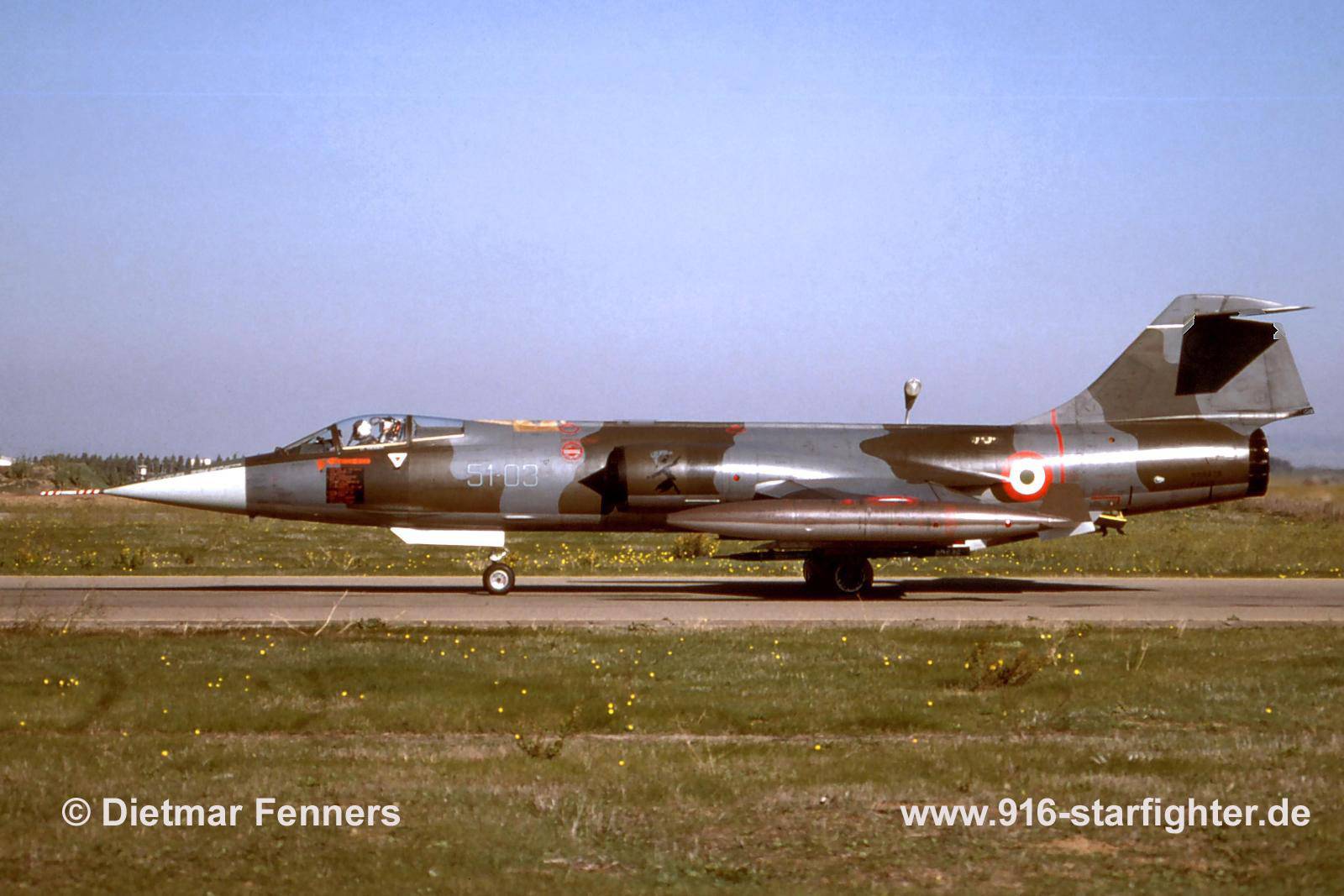 F-104S "51-03" 22°Gruppo of 51°Stormo at Decimomannu AB in October 1986 F-104S, construction number 783-1179, serial number MM6879, model 783, built by Aeritaliadelivery date AMI 31.10.19/75; delivery date 23°Gruppo of 5 Stormo 6.11.1975, 5-41 15.1.1976-12.1979; IRAN 20.7.1979-14.3.1980 delivery date 9°Gruppo of 4 Stormo 1.4.1980, 4-12 04.1980-10.7.1983; IRAN 10.7.1984-29.3.1985; delivery date 22°Gruppo of 51 Stormo 16.4.1985, 51-03 04.1985-28.7.1989 Tactical Air Meet at Sollingen in June 1988; July 1988 22 Gruppo based at Istrana AB exchanged with Royal Air Force 111 Squadron at Leuchars flying the Phantom FG.1 IRAN + F-104S ASA conversion 28.7.1989-25.10.1990; delivery date 22°Gruppo 31.10.1990, 51-02 26.11.1990-15.2.1995 August 1992 the Italian Air Force 22 Gruppo based at Istrana, flying the F-104S ASA exchanged with the Dutch Air Force 322 Squadron, based at Leeuwarden AB, flying the F-16A static during air show August 29 1993 at Florennes AB, Belgium; IRAN 15.2.1995-7.5.1997; respray in grey camouflage scheme; delivery date 10°Gruppo of 9 Stormo 16.5.1997 9-53 30.2.1997-15.9.1999; March 1999 at Amendola AB for Operation Allied Force; delivery date 9°Gruppo 15.9.1999, 4-15 24.9.1999-4.3.2002 last flight to Trapani 6.2.2002 with 4.254 flight hours; withdrawn from use in 40.2002 after structural damage sustained by too much "G"s dump 6.5.2002-11.3.2003, dump Grazzanise 2.9.2003-7.4.2009; no further information; scrapped. copyright © Dietmar Fenners