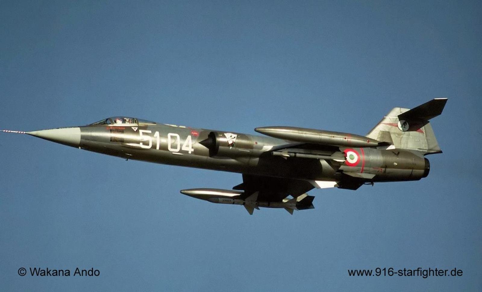 F-104S "51-04" 22°Gruppo of 51°Stormo from Istrana AB in "typical" Air Defence configuration 1975 F-104S, construction number 783-1006, serial number MM6706, model 783, built by Aeritalia at Turin, Caselleproduction line 14.2.1969; delivery date AMI 3.7.1969; 51-04 51°Stormo 07.1969-27.11.1973; IRAN 23.11.1973-25.6.1974 delivery date 22°Gruppo of 51°Stormo 11.7.1974, 51-04 07.1974-29.3.1976 delivery date 10°Gruppo 29.3.1976, 9-33 04.1976-25.9.1978; IRAN 25.9.1978-30.5.1979 delivery date 22°Gruppo of 51°Stormo 26.6.1979, 51-10 07.1979-5.1.1984; IRAN from 5.1.1984 4-1 9°Gruppo of 4°Stormo 01.1985-21.8.1986 crashed and written off August 21, 1986 at Monti di Pietralunga near Perugia after ground contact during a looping (CFIT), pilot was killed; 2.601 flight hours. copyright © Wakana Ando