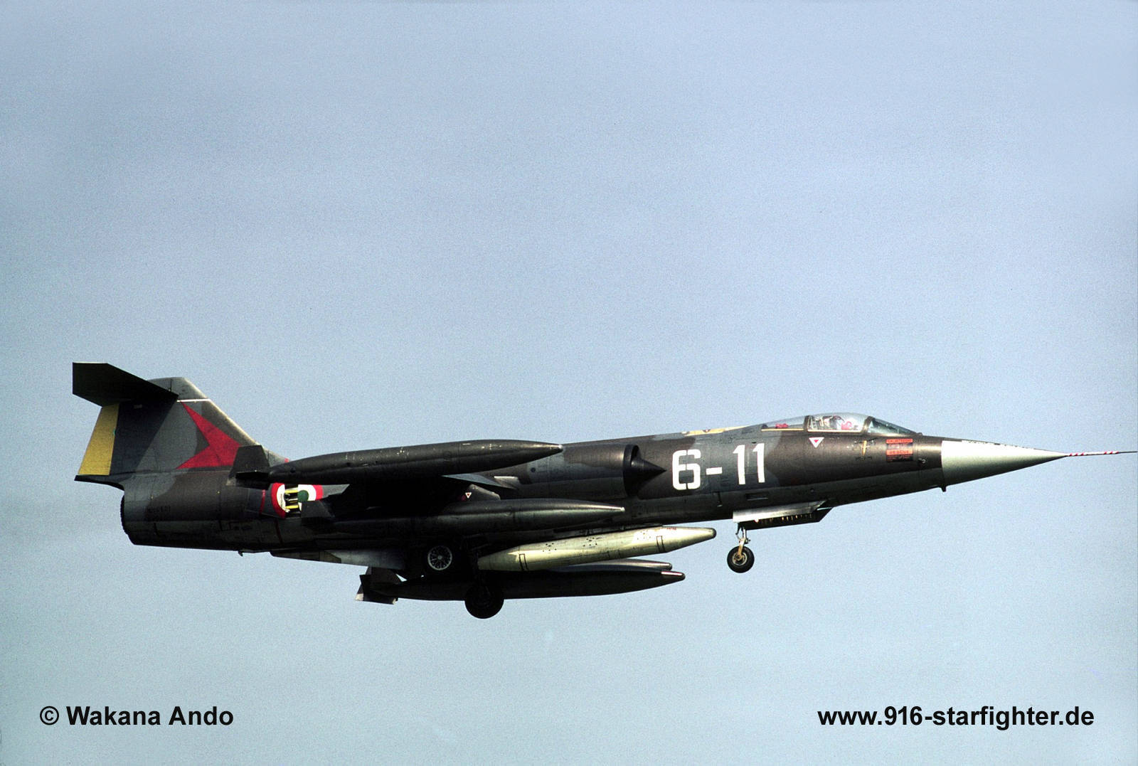 F-104G "6-11" 154°Gruppo of 6°Stormo "Alfredo Fusco" of Aeronautica Militare Italiana (Italian Air Force) F-104G, construction number 683D-6517, serial number MM6517, model 683-10-19, built by FIATdelivery date AMI 30.5.1963; alluminium color; 154°Gruppo 6 Aerobrigata 17.6.1963; IRAN till 16.12.1968; delivery date 154°Gruppo 16.12.1968, 6-?? 12.1968-3.7.1972 IRAN 3.7.1972-11.6.1973; delivery date 154°Gr 11.6.1973, 6-13 '73; uncoded 7.11.1973; 6-03 154 Gruppo CBOC/S 6 Stormo "Alfredo Fusco" 4.11.1974 6-11 154 Gruppo 6 Stormo 04.1975-5.4.1976; IRAN 5.4.1976-7.1.1977; delivery date 132°Gruppo 7.1.19/77, 3-04 132 Gruppo 25.1.1977-24.4.1980; IRAN 24.4.1980-13.2.1981 delivery date 154°Gruppo 13.2.1981, 6-14 154 Gruppo CBOC/S 6 Stormo "Alfredo Fusco" 03.1981-5.10.1981 written off September 5,1981 Maniago with 2937 flight hours; 6-14 crashed during recovery maneuver at low altitude in a gunnery event at Maniago range. pilot was killed. copyright @ Wakana Ando