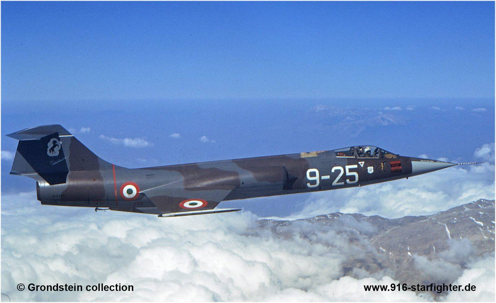 F-104G "9-25" 10°Gruppo of 9°Stormo CIO from Grazzanise AB 1972, zapped with JG 71 badge below the cockpit F-104G, construction number 683D-6593, serial number MM6593, model 683-10-19, built by FIATdelivery date AMI 17.6.1964; delivery date 102°Gruppo 22.6.1964, 5-20 06.1964-1.7.1966; delivery date 10°Gruppo 1.7.1966, 9-? 07.1966-26.4.1968; IRAN 26.4.1968-6.11.1968 delivery date 102°Gruppo 6.11.1968, 5-? 11.1968-6.4.1971; IRAN 6.4.1971-5.1.1972; delivery date 10°Gruppo at Grazzanise 5.1.1972, 9-05 01.1972-26.10.1973 exchange with JG 71 at Wittmundhafen 4. to 14. July 1972 coded 9-05; coded 9-25 on September 21, 1972; delivery date 3°Stormo 26.10.1973; IRAN 20.2.1975-19.12.1975 delivery date 3°Stormo 19.12.1975, 3-44 10.1976; 3-42 06.1977; 3-41 15.11.1977-4.4.1978 "Avon Express 1977" 15. till 26. November 1977 AMF (Allied Command Europe-Mobile Force) exercise at RAF Coningsby; IRAN 6.7.1979-15.2.1980 delivery date 28°Gruppo 15.2.1980, 3-34 27.10.1981-01.1984; 3-41 07.1984, 20-27 08.1984-04.1985; 4-45 04.1985-14.8.1985; IRAN 26.5.1985-18.1.1986 delivery date 132°Gruppo 18.1.1986, 3-05 06.1986-30.9.1989; "Ardent Ground" an AMF (Allied Command Europe - Mobile Force) exercise at Florennes April-Early May 1988 August 1989 MFG 1 (2nd Staffel), based at Schleswig Jagel, flying the Tornado IDS, exchanged with the Italian Air Force 132° Gruppo based at Villafranca last flight 11.12.1989, total 3.739 flight hours; withdrawn from use 13.2.1990, stored Villafranca 1993; destroyed CFE in 1995, Villafranca dump 31.7.1997 tail/fuselage separated 2003 noted; dump Villafranca June 2006 noted. copyright © Grondstein collection