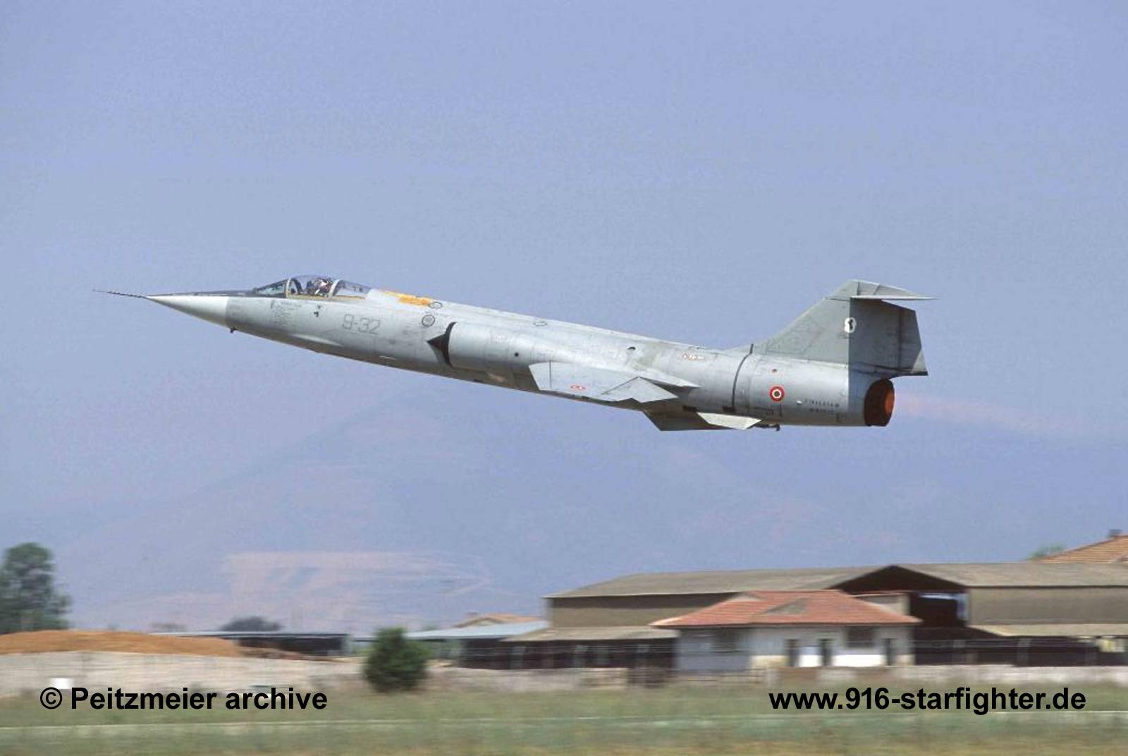 F-104S.ASA-M "9-32" 10°Gruppo of 9°Stormo "Francesco Baracca" take-off from Grazzanise AB 2003 F-104S, construction number 783-1235, serial number MM6935, model 783, built by Aeritalia at Turin, Casellebuilt by Aeritalia at Turin Caselle; delivery date AMI 16.8.1978; delivery date 21°Gruppo; CIO 53°Stormo Cameri AB 21.8.1978, 53-15 18.4.1979-16.2.1983; IRAN 16.2.1983-18.1.1984 delivery date 21°Gruppo 18.1.1984, 53-16 03.1984-4.6.1987; delivery date 12°Gruppo CIO of 36°Stormo Gioia del Colle AB 4.6.1987, 36-06 09.1987-17.5.1988 IRAN + F-104S.ASA conversion 17.5.1988-20.10.1989; delivery date 22°Gruppo CIO of 51°Stormo Istrana AB 12.1989, 51-05 12/89-18.2.1994 IRAN + F-104S.ASA-M conversion with Alenia 18.2.1994-11.12.1997; 1.ASA-M production airframe completed 11.12.1997 grey camouflage scheme; delivery date 23°Gruppo CIO of 5°Stormo Cervia AB 11.12.1997 5-30 30.2.1998-18.5.2000, Special black-yellow colors were applied for the "82 anno" anniversary of 23°Gruppo; 15.10.2000-14.11.2000; IRAN at Alenia 14.11.2000-15.7.2002 delivery date 10°Gruppo of 9°Stormo Grazzanise AB 19.7.2002, 9-32 2.9.2002-29.10.2004; 3.721 flight hours, withdrawn from use 1.11.2004; April 2005 operational storage for 311°Gruppo Aero Club "Francesco Baracca" at Lugo di Romagna, 26 km W of Ravenna; August 11, 2009 first noted, grey camouflage scheme, no CFE plate or identification, without any identity marks August 11, 2009 without serial but with Baracca badge noted; September 2012 noted; June 2022 noted. It is meant to remember the pilots who lost their lives during wars in the past. copyright © Peitzmeier archive