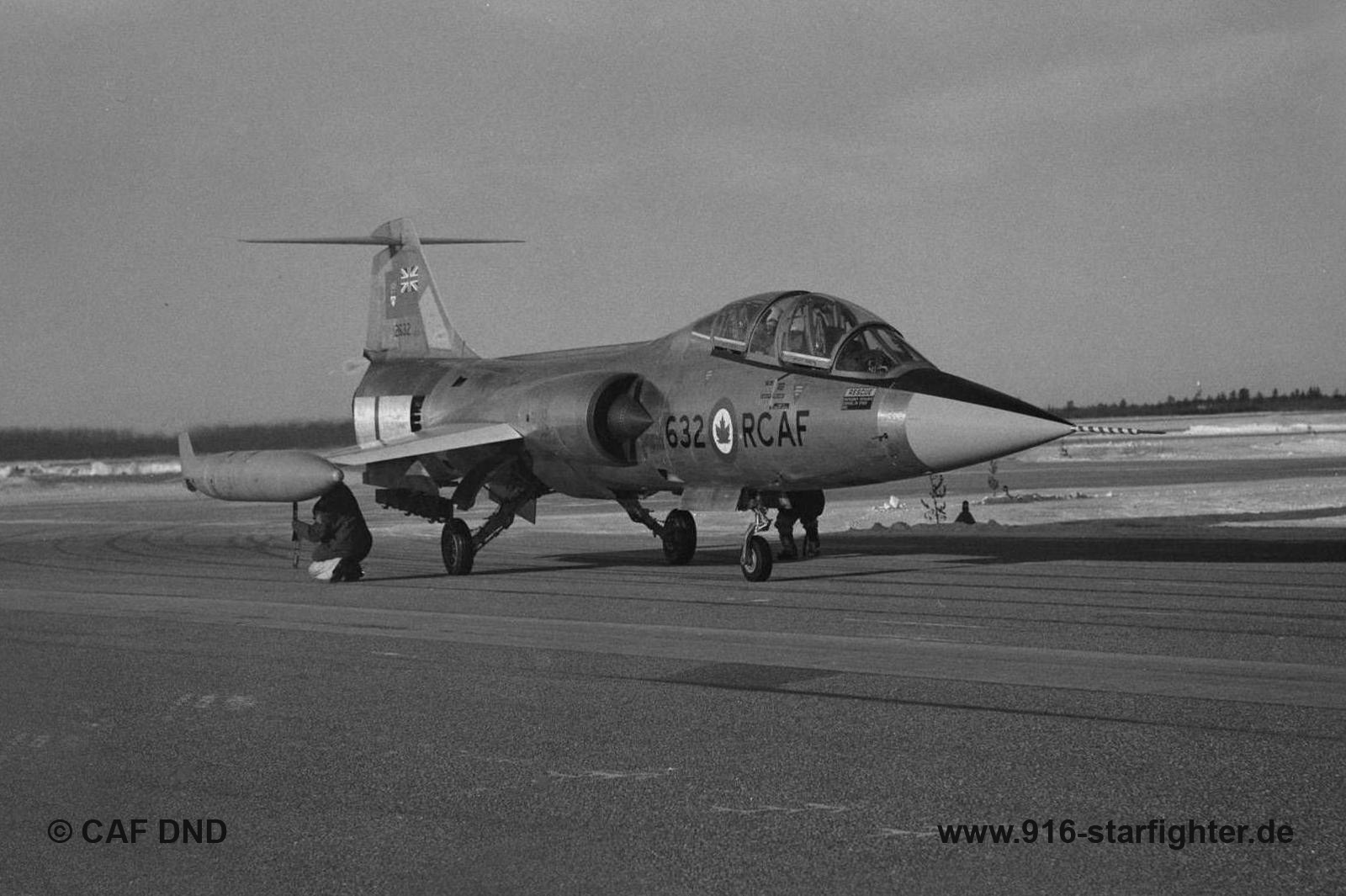 CF-104D "632" of test squadron "Central Experimental and Proving Establishment" (CEPE) at Cold Lake in Silver-finish colors in February 1963 CF-104D, Lockheed model 583-04-15, Lockheed construction number 583A-5302, RCAF serial number 12632, Mk.1 (Dual Training Aircraft), built by Lockheedbuild for the Canadian Armed Forces this Starfighter was received on May 1.1962 and flew with the Canadians until May 23, 1973 632 was stationed at CFB Cold Lake in Northern Alberta, Canada at the 6 Strike and Reconnaissance Operational Training Unit