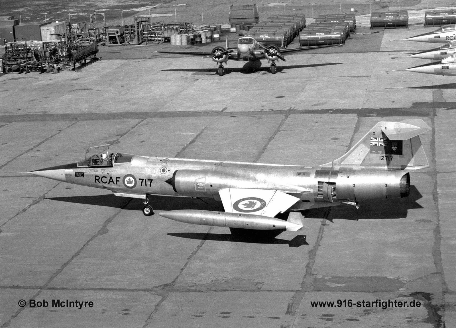 CF-104 "717" after a factory test flight for Canadair at Cartierville after a test flight on March 28, 1963 CF-104, Canadair model CL-90, Lockheed model 683-04-12, Canadair construction number 683A-1017, RCAF serial number 12717, built by CanadairMarch 12, 1963 taken on strength at CFB Sollingen; first unit 1 AD Europe; with 444 (F) Squadron at Baden-Sollingen, Germany in 1960s; June 19, 1970 to SR ADCSU Lahr August 18, 1970 to SAL for storage; seen at Prestwick on June 4, 1972, waiting delivery to Norway; reported stored at Prestwick, Scotland on December 2, 1972, still with RCAF serial marked