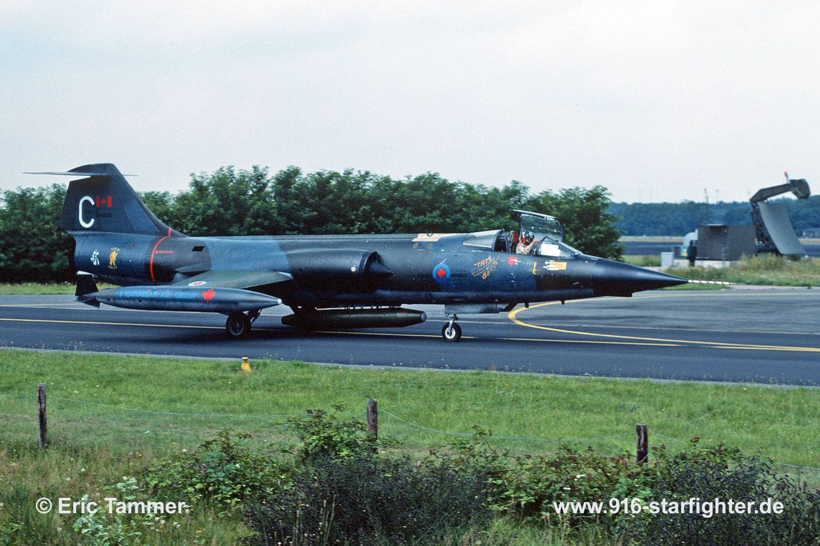 CF-104 "806" (104806) of 1 CAG (Canadian Air Group) at TAM80 at Ramstein AB 1980 CF-104, Canadair model CL-90, Lockheed model 683-04-12, Canadair construction number 683A-1106, RCAF serial number 12806, built by Canadairfirst flight June 14, 1962; after 8 flights with 12:20 flight hours taken on service October 2, 1962; delivered to Germany with C-130 November 10, 1962 first unit 1 Air Division (1 AD) RCAF; returned to Canadair for maintenance October 7, 1965; back to Germany April 12, 1966; reserialed as 104805 effective June 2, 1970 participated in the 1980 Tactical Air Meet at Ramstein AB. It wore a large "C" on the tail and a red maple leaf on the tip tanks with a stylized blue "1 Canadian Air Group" superimposed on it Each "i" was dotted with a small red maple leaf; withdrawn from use April 21, 1986