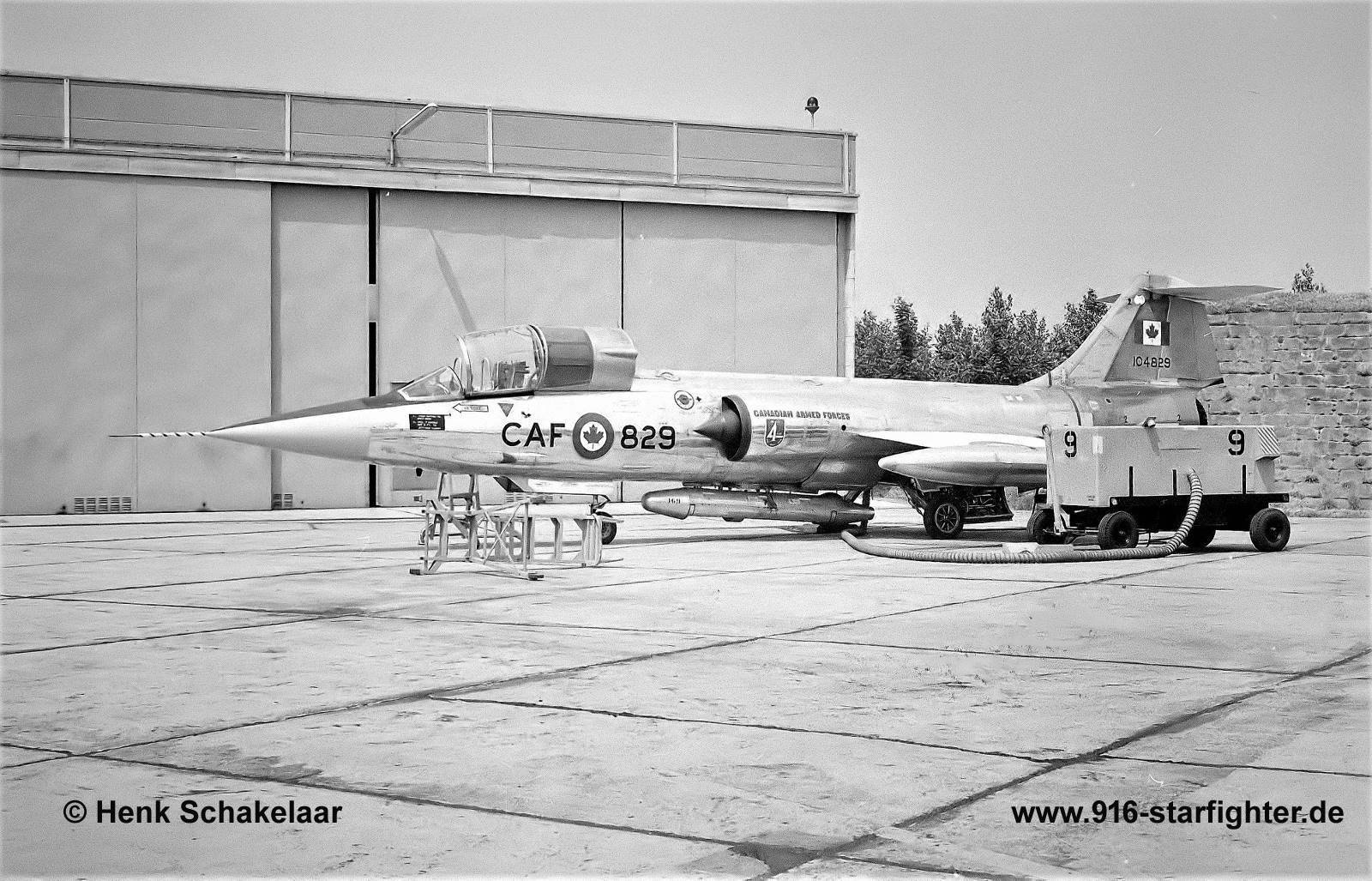 CF-104 "829" (104829) of 3 Wing with 4.ATAF team at TWM at Norvenich AB in June 1969 CF-104, Canadair model CL-90, Lockheed model 683-04-12, Canadair construction number 683A-1129, RCAF serial number 12829, built by CanadairOctober 2,1962 to 3 Wing; January 24, 1969 to Sollingen; TWM at Norvenich AB in June 1969 with 1 Air Division team for 4.ATAF; reserialed as 104829 effective June 1970 September 20, 1974 to SAL for cannon installation and wing rework; returned to 1 CAG at Sollingen; at Greenham Common August 1976 with 439 squadron of 1 CAG (Canadian Air Group) November 28, 1977 to SAL for variegated painting; returned to Sollingen; December 6, 1978 to NWI for DLIR; returned to Sollingen with 421 Squadron at CFB Baden-Sollingen, Germany at time of crash on August 18, 1978, caused by engine failure due to bird strike. Pilot ejected safely. Lockheed C-2 seat, written off (January 16, 1979 struck off). SAL: Scottish Aviation Limited, Prestwick, UK NWI: North West Industries, Edmonton DLIR: Depot Level Inspection and Repair copyright @ Henk Schakelaar