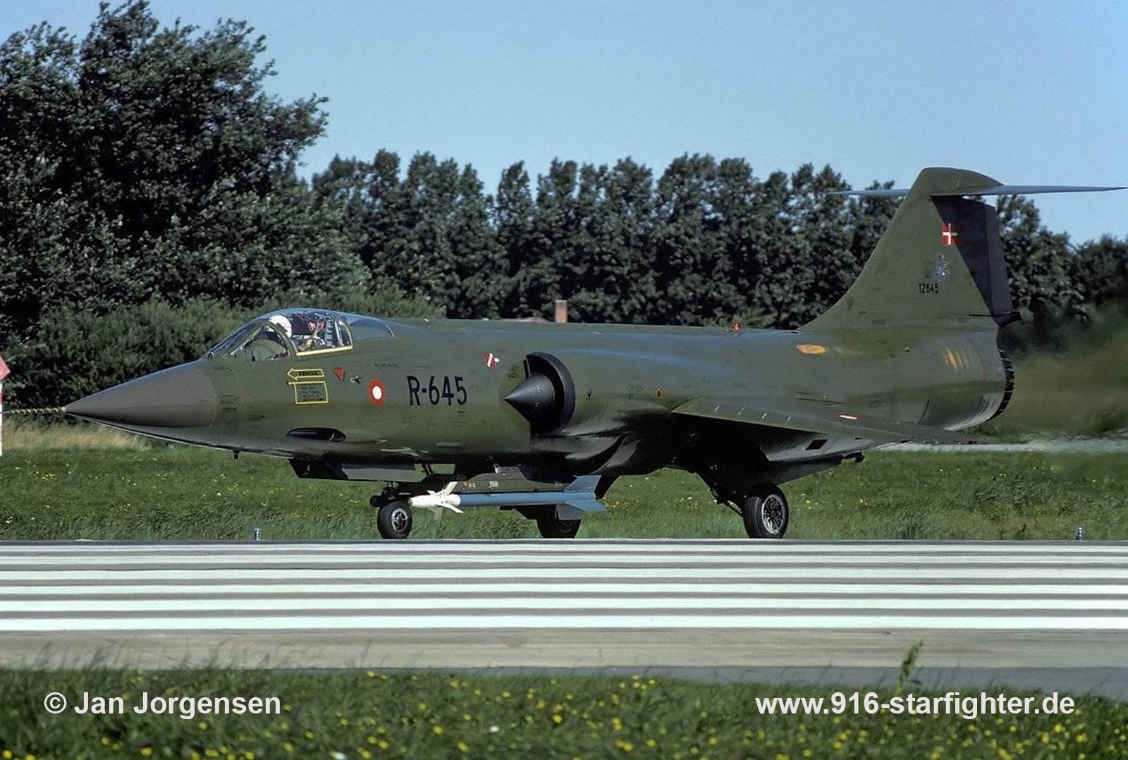 F-104G "R-645" 723 Esk RDAF at Aalborg AB 1981 F-104G, construction number 683D-6094, model 683-10-19, US serial number 63-13645, built by Canadair manufactured by Canadair; first flight December 14, 1964 at Canadair; ready at Canadair on March 2, 1965first flight December 7, 1964 at Canadair; ready at Canadair February 15, 1965; delivered February 15, 1965 to USAF, coded "FG-645/33645" to MOAMA Brookley, Alabama shipped to Denmark; the aircraft arrived at Nørresundby, Denmark on escort carrier USS "Croatan" June 5, 1965 MAP (Military Assistance Program) to Denmark at Aalborg coded R-645 on June 5, 1965; Esk 726 delivery date July 8, 1965; Esk 723 in March 1966 repainted in an all green camouflage scheme on November 5, 1969; July 1, 1983 to Esk 726; last flight April 11, 1986; withdrawn from use April 30, 1986 with 4.099 flying hours preserved and disassembled at Aalborg and transported by road to Aarhus for shipment to Bremerhaven on April 6, 1987