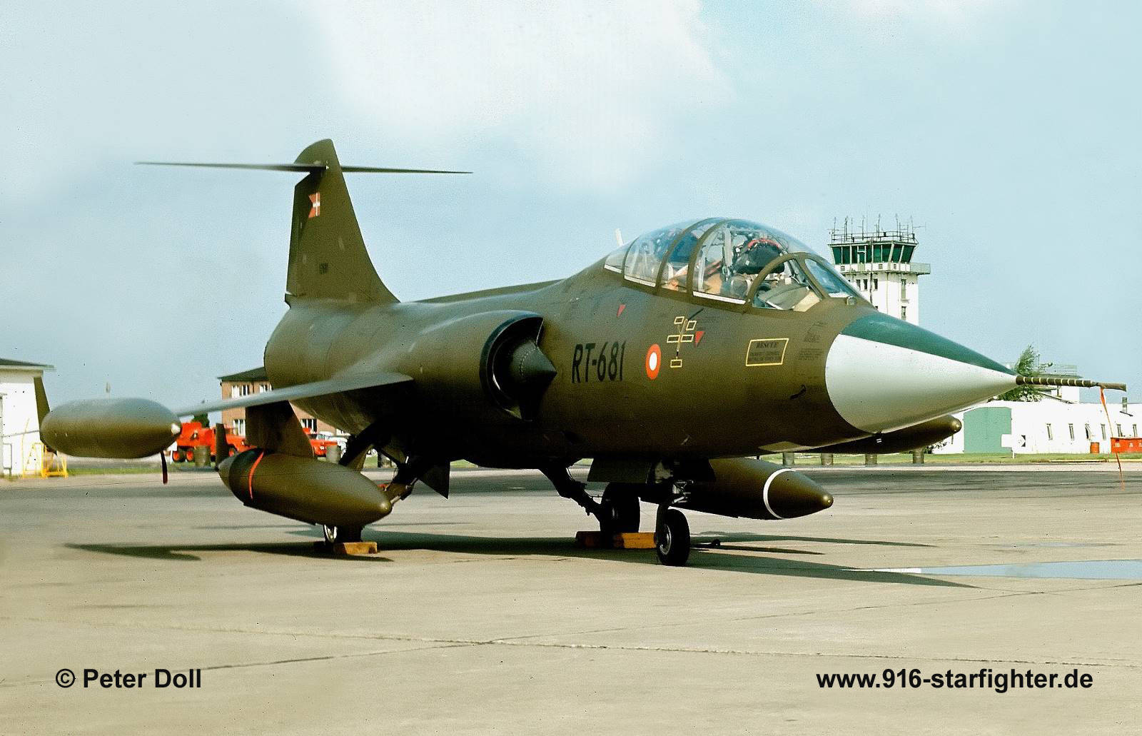 TF-104G "RT-681" Esk 723 RDAF at Rhein-Main AB, Frankfurt 1975 TF-104G, construction number 583C-5525, model 583-10-20, US serial number 63-12681, built by Lockheed manufactured by Lockheed; assembly at Lockheed, Palmdale; Lockheed test flights on July 31, 1964 at Palmdale, CA; USAF delivery date on August 12, 1964 to Brookley AFB, Mobile, Alabamaassembly at Lockheed, Palmdale; Lockheed test flights on April 31, 1964 at Palmdale, CA; USAF delivery date on August 6, 1964 to Brookley AFB, Mobile, Alabama MAP to Denmark on November 23, 1964 by ship "USS Fiddler" to Nørresundby harbour; Esk 726 coded RT-681 on December 7, 1964; Esk 723 on October 6, 1966 February 4, 1969 painted in an all green camouflage scheme; crashed with Esk 723 on June 13, 1975 NW of Fynshoved into the sea due to a Compressor Stall with 2.508 flight hours both pilots ejected safely; rescued by a fishing boat. copyright © Peter Doll