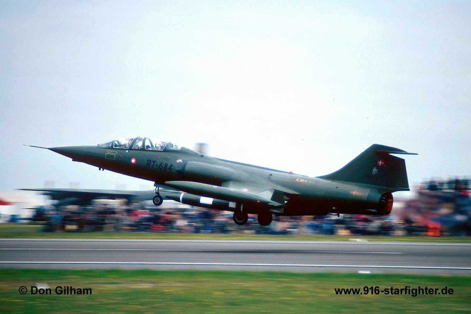 TF-104G "RT-684" RDAF at the IAT (International Air Tattoo) at Greenham Common, UK in June 1981 TF-104G, construction number 583C-5528, model 583-10-20, US serial number 63-12684, built by Lockheed manufactured by Lockheed; assembly at Lockheed, Palmdale; Lockheed test flights on September 28, 1964 at Palmdale, CA USAF delivery date on December 18, 1964 to Brookley AFB, Mobile, AlabamaMAP (Military Assistance Program) to Denmark on June 5, 1965 on escort carrier USS "Croatan" to Nørresundby harbour coded RT-684 July 8, 1965 to Esk 726 with 9 flight hours; April 25, 1969 painted in an all green camouflage scheme repainted in glossy green camouflage scheme on November 17, 1976; last flight April 11, 1986 with 4.476 flight hours; withdrawn from use April 30, 1986 preserved and disassembled at Aalborg and transported by road to Aarhus for shipment to Bremerhaven March 2, 1987