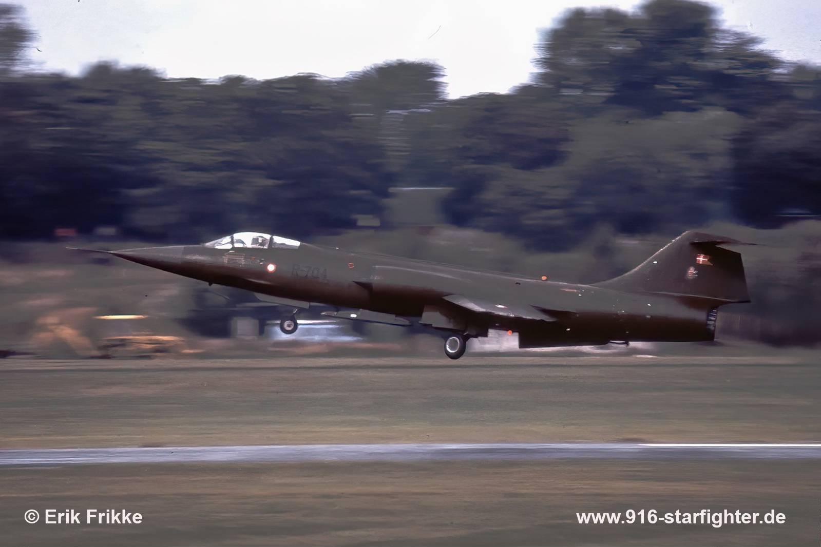 CF-104 "R-704" 726 Esk RDAF October 1975 CF-104, Canadair model CL-90, Lockheed model 683-04-12, Canadair construction number 683A-1003, RCAF serial number 12703, built by Canadairroll out July 12, 1961; 703 was taxi tested in July 1961; first flight August 14, 1961 at Canadair in Cartierville, flown by R.M. 'Bill' Kidd (Canadair pilot) taken on service by RCAF as CF-104 s/n 12703 on November 22, 1961 after 11 flights with 15:10 flight hours extensively damaged (B Category accident) January 16, 1962 on initial delivery flight at SAC base Duluth AFB, Minnesota undershooting the runway on approach, aircraft catching the top cable of a BAK 7 net barrier at the SAC base at Duluth on final when his hook had accidentally dropped during the flight from Cold Lake to Trenton January 22, 1962 back to Canadair and reinserted in production line for repair, redelivered to RCAF May 3, 1962; first unit CEPE; RCAF 1 Wing Marville, France on January 7, 1964 June 29, 1964 it was transferred to the 1 Air Division 3 Wing; July 22, 1965 it was transferred back to the 1 Air Division 1 Wing at Lahr in April 1966 it was seen wearing badges from 441 squadron at Marville, France; reserialed as 104703 effective June 1970; struck off service September 24, 1971; sold to Denmark September 24, 1971