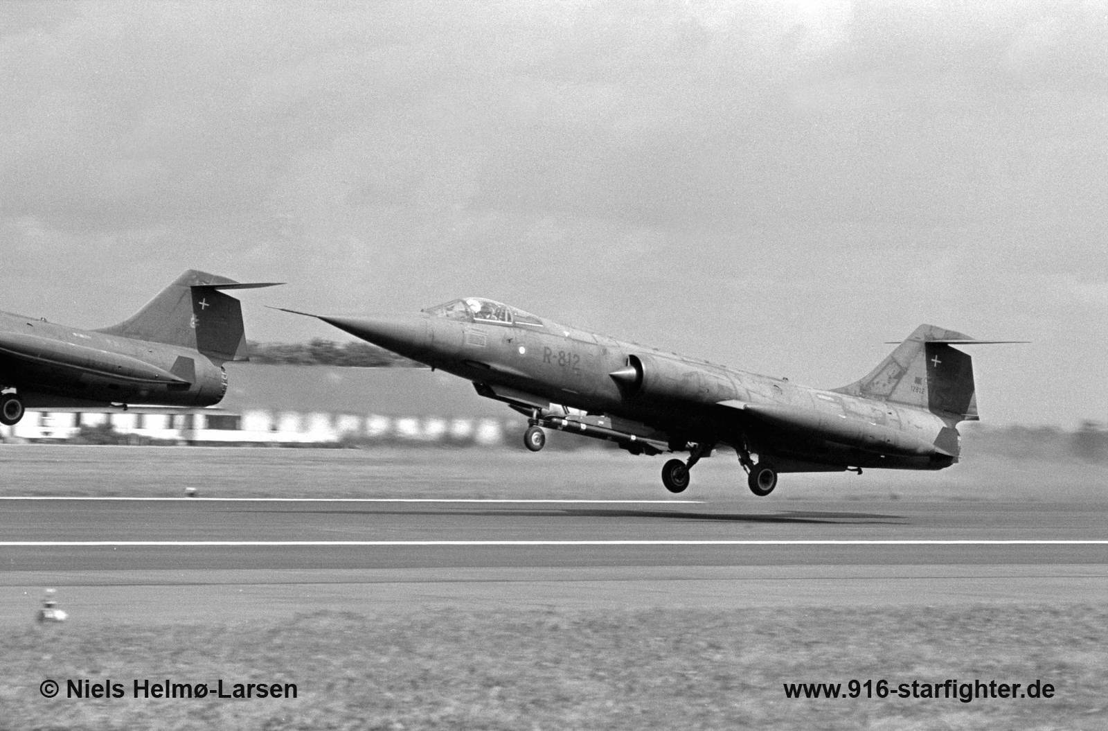 CF-104 "R-812" 726 Eskadrille of RDAF in "Air Defence" configuration in July 1978 CF-104, Canadair model CL-90, Lockheed model 683-04-12, Canadair construction number 683A-1112, RCAF serial number 12812, built by Canadairfirst flight June 29, 1962, ready at Canadair January 16, 1963 after 6 flights with 9:25 flight hours; delivered to Germany February 7, 1963 with a C-130 transporter first unit 3 Wing, Zweibrucken in 1963; June 24, 1970 last operational flight with CAF; September 15, 1970 to SAL, Prestwick; to Lockheed for MAP modifications