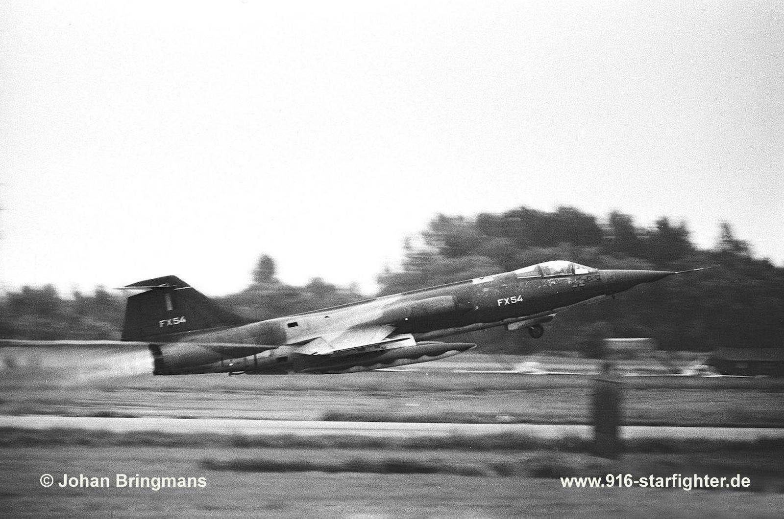 F-104G "FX54" 1 Wing BAF at the Brustem-St .Truiden Air Show green/brown colour scheme in June 1968 F-104G, construction number 683D-9097, model 683-10-19, built by SABCAtaken on service June 1, 1964 at Gosselies AP; delivery date in June 1964 to 10 Wing February 1, 1965 damaged during maintenance because the main fuel tank exploded, left air intake was damaged, fire in the engine with 31 squadron at Tiger Meet 1966 at RAF Leuchars July 1966. This year RAF 74 Squadron was hosting the Tiger Meet. TWM at RAFG Wildenrath with 10 Wing in June 1967 December 22, 1967 damage caused by melting snow on the runway during take-off; with 31 squadron at Tiger Meet 1970 at Kleine-Brogel in July 1970 March 22. 1973 at Beauvechain blown tire during the landing with 349 squadron; "Slivers" demo team in 1973 at Salon Eyguieres, Spangdahlem and Bentwaters in 1974 with "Slivers" demo team at Ramstein; FX54 crashed with 350 squadron of 1 Wing September 16, 1980 at Authe, France after loss of power and engine fire, pilot ejected safely, written off. copyright © Johan Bringman