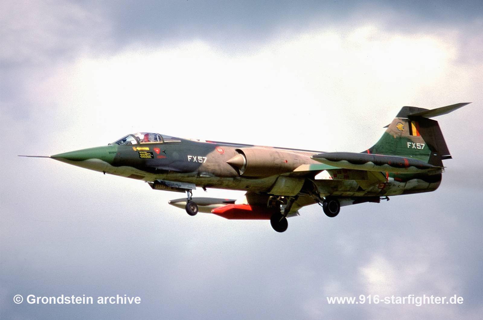F-104G "FX57" 1 Wing BAF landing at Leeuwarden AB during a Gunnery Camp in August 1978 F-104G, construction number 683D-9099, model 683-10-19, built by SABCAtaken on charge May 15, 1964; June 4, 1964 delivered from SABCA to 31 squadron of 10 Wing at Beauvechain June 18, 1964 during a GCA-flight the aircraft was damaged in a hailstorm (350 Squadron) aircraft was repaired soon April 23, 1974 birdstrike (349 Squadron), pilot could land safely at Hahn Air Force Base and was ok August 18, 1978 lost a flap in flight near Macquenoise while performing a dart mission, carrying the dart, aircraft was repaired soon (350 Squadron) April 14, 1981 arrived at Koksijde for storage (350 Sqn 1 Wing); January 1987 sold to Radcomm Enterprise and struck of charge