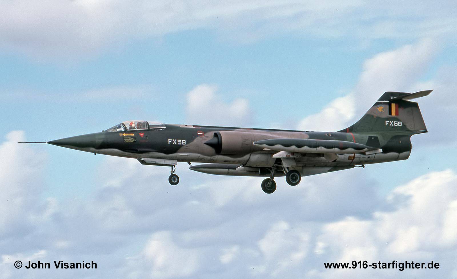 F-104G "FX58" 1 Wing Belgium Air Force at Luqa, Malta IAP October 13, 1976 F-104G, construction number 683D-9101, model 683-10-19, built by SABCAJune 25, 1964 taken on charge for 1 Wing; in 1967 to 10 Wing; in 1970 to 1 Wing again; flown by the "Slivers" in 1973/74 April 1976 349 Squadron (1 Wing) based at Beauvechain exchanged with 43 Squadron, operating the Phantom FG.1 at Leuchars November 1977 IRAN at SABCA, Gosselies; September 15, 1980 arrived at Koksijde for storage (350 Squadron/1 Wing) in January 1987 sold to Radcomm Enterprise and struck of charge; in 1989 stripped of all useful parts; July 1991 last noted stored at Koksijde June 1992 first noted for BDRT at Beauvechain; September 1995 arrived for storage at Weelde (reserve Brussels Air Museum); April 1998 tail on dump Weelde rest of aircraft was transported to Kapellen (museum depot); 2000 tail noted stored Peutie 2001 fuselage stored Gosselies (with tail of another aircraft); 2006 tail used for restauration of FX-69 at Charleroi August 2011 FX58 tail only spotted at Kessel with PS-Aero; no further information; scrapped. copyright © John Visanich