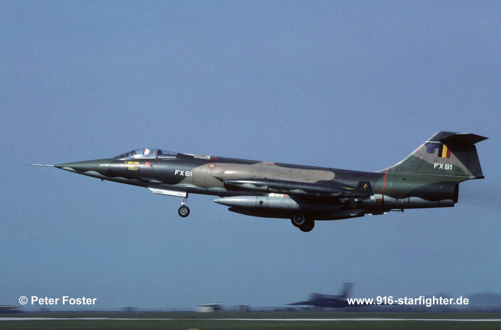 F-104G "FX61" 10 Wing BAF at RAF Waddington Exercise "Elder Forest" in April 1980 F-104G, construction number 683D-9104, model 683-10-19, built by SABCA manufactured by West Group (ARGE-West); assembly at SABCA-Gosselies, Belgiumtaken on service June 2, 1964; initially to 10 Wing; March 18, 1970 CAT 4 damaged, but no information about what happened, repaired by SABCA and given to 1 Wing back to 10 Wing in June 1976; withdrawn from use and stored September 26, 1983; at Tiger Air Forces Museum at Peer near Kleine-Brogel in 1989 23 squadron markings, lacking both its wings; stored in 1992; preserved outside at the Kleine Brogel Air Museum in front of building 15; aircraft carries tail from FX86 2004 noted at Base museum at Kleine Brogel; 2024 noted. copyright © Peter Foster