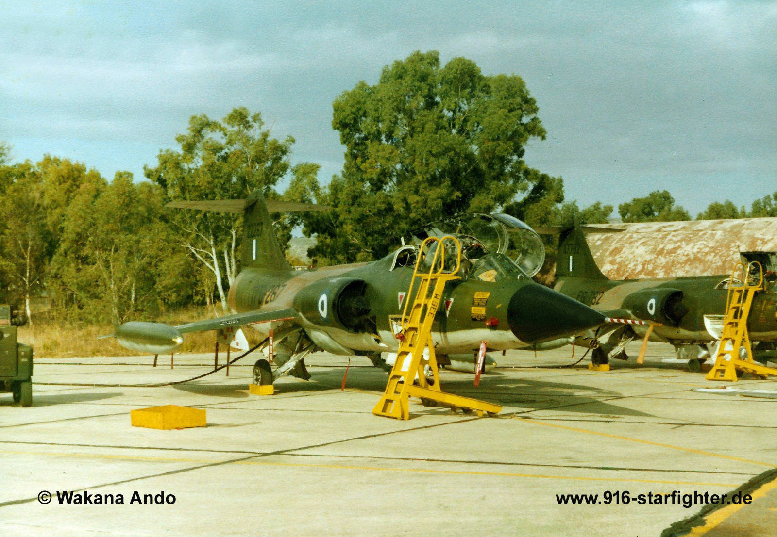 TF-104G "TFG-267" of 116 Wing Hellenic Air Force at Araxos AB in 1984 TF-104G, construction number 583C-5512, model 583-10-20, US serial number 62-12267, built by Lockheed manufactured by Lockheed; assembly at Lockheed-Palmdale; Lockheed test flights at Palmdale, CA; MAP operated by USAF for foreign pilot training, coded FG-267 with 4450th CCTW at Luke AFBMAP (Military Assistance Program) to Greece in February 1969 to 116 Wing at Araxos AB coded "FG-267" crashed coded "TFG-267" March 16, 1987 in the area of Meligala Messinia, the pilots successfully abandoned. During a training flight with another TF-104G and while performing a "Barrel-Roll" at a bank angle of 30 degrees the crew heard a loud bang and felt severe shaking while aircraft became uncontrollable. One pilot ejected at about 14000' while the 2nd pilot at about 5.000'. 1st Lt. Nikolaos Fifas & Cpt. El. Apostolopoulos who had his 2nd ejection in 2 years, both with a TF-104G. copyright © Wakana Ando
