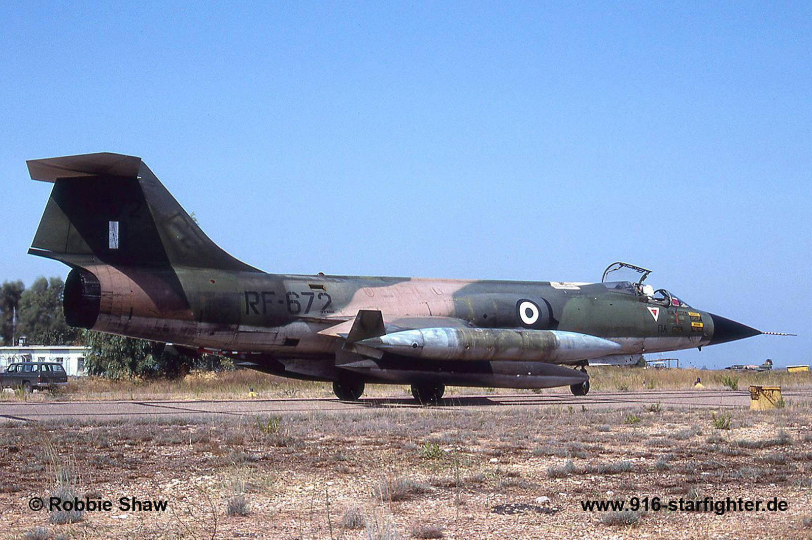 RF-104G "RF-672" 335 squadron of 116 Combat Wing of Hellenic Air Force at Araxos in April 1993 RF-104G, construction number 683D-6672, company model 683-04-10, built by FIAT (Fabbrica Italiana Automobili Torino)manufactured by Italian Group (ARGE-Italien); RF-104G production in Photoreconnaissance version; first flight April 9, 1965 coded KC+151 at FIAT, Turin-Caselle project "Earl" (for MFG 2) as RF-104G with AS.30 "Kormoran" anti-ship missile delivery system installed camouflage scheme "Norm 62" according tech order "TA-196"; acceptance date May 21, 1965 by BABwFIAT VB+212 MFG 2 (Navy Wing 2) at Eggebek AB delivery date on May 26, 1965 21+17 Navy camouflage scheme "Norm 76" according tech order "TA-196-3" in 1971 modified to MARINE-Recce version according tech order "TA-1401" with Side Oblique Camera (SOC) KS-87B on January 15, 1979; back to MFG 2 on March 23, 1979; ErpSt 61 at Manching AB on April 24, 1984 withdrawn from use at LwSchleuse 11 on December 4, 1985 with 3.075 flight hours; struck off charge order (AVA) January 10, 1986
