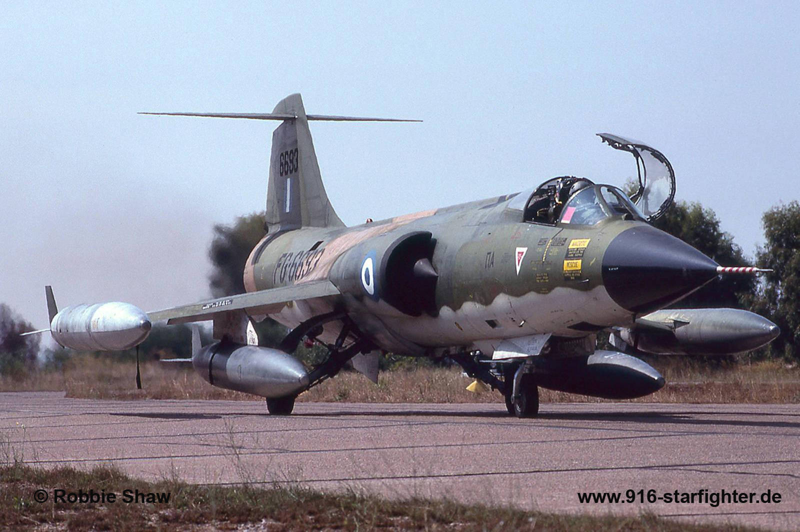 RF-104G "FG-6693" 335 squadron of 116 Combat Wing of Hellenic Air Force at Araxos in April 1993 RF-104G, construction number 683D-6693, company model 683-04-10, built by FIAT (Fabbrica Italiana Automobili Torino)manufactured by Italian Group (ARGE-Italien); RF-104G production in Photoreconnaissance version; first flight August 27, 1965 coded KC+166 by FIAT at Turin-Caselle project "Earl" (for MFG 2) as RF-104G with AS.30 "Kormoran" anti-ship missile delivery system installed camouflage scheme "Norm 62" according tech order "TA-196"; acceptance date December 2, 1965 by BABwFIAT VB+227 MFG 2 at Eggebek AB delivery date December 2, 1965 21+32 Navy camouflage scheme "Norm 76" according tech order "TA-196-3" in 1969 modified to MARINE-Recce version according tech order "TA-1401" with Side Oblique Camera (SOC) KS-87B on February 22, 1979 at MBB, back to MFG 2 on August 27, 1979 to Luftwaffenschleuse 11 on July 13, 1982 for AN/ALE-40(N) Chaff/Flare countermeasure dispenser equipment according tech order "TA-1469", back to MFG 2 on August 20, 1982; May 5, 1987 to LVR 1 TechnGrp 11 "F-104 Kommando" at Erding AB withdrawn from use at LwSchleuse 11 in 1988 with 3.071 flight hours; struck off charge order (AVA) January 4, 1988