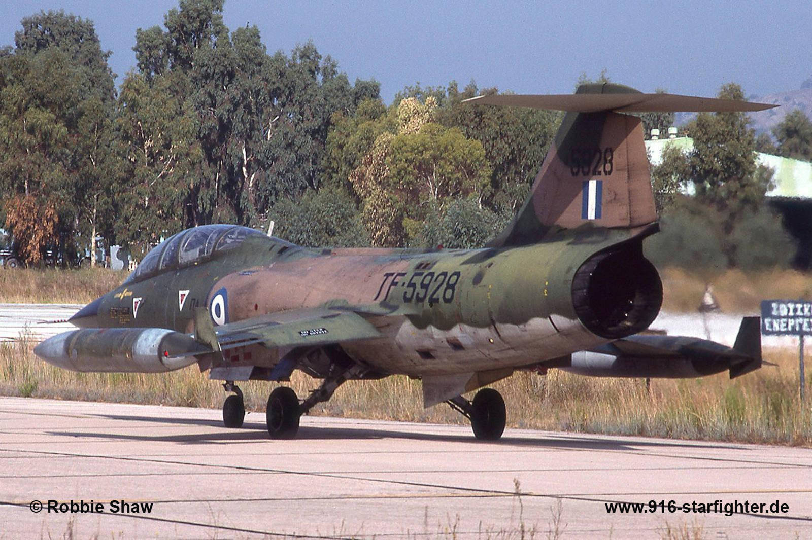 TF-104G "TF-5928" 335 squadron of 116 Combat Wing of Hellenic Air Force at Araxos September 1991 TF-104G, construction number 583F-5928, company model 583-10-20, built by Messerschmitt (MTT)manufactured by Lockheed and Messerschmitt (ARGE-Süd); assembly according contract lot 6 fuselage assembled at Messerschmitt-Augsburg, wings manufactured at Messerschmitt-Manching ARGE-Süd parts (fuselage, wings and tail) airlifted to USA in September 1965 with a Canadair CL-44D airfreighter of "Flying Tiger Line" at Lockheed-Burbank assembled and test flights coded KF+228 at Palmdale in 1965 airlifted to Ypenburg, Netherlands on February 7, 1966 with a Canadair CL-44D of "Flying Tiger Line" for reassembling camouflage scheme "Norm 62" according tech order "TA-196"; acceptance date May 10, 1966 by BABwFokker YA+120 ErpSt 61 at Manching AB delivery date on May 13, 1966 for experimental tests 27+98 WaSLw 10 at Jever AB on August 23, 1973; JaboG 32 at Lechfeld AB on February 14, 1983; JaboG 34 at Memmingen AB on March 20, 1984 withdrawn from use and stored at LwSchleuse 11 on March 18, 1987; struck of charge order (AVA) February 10, 1989