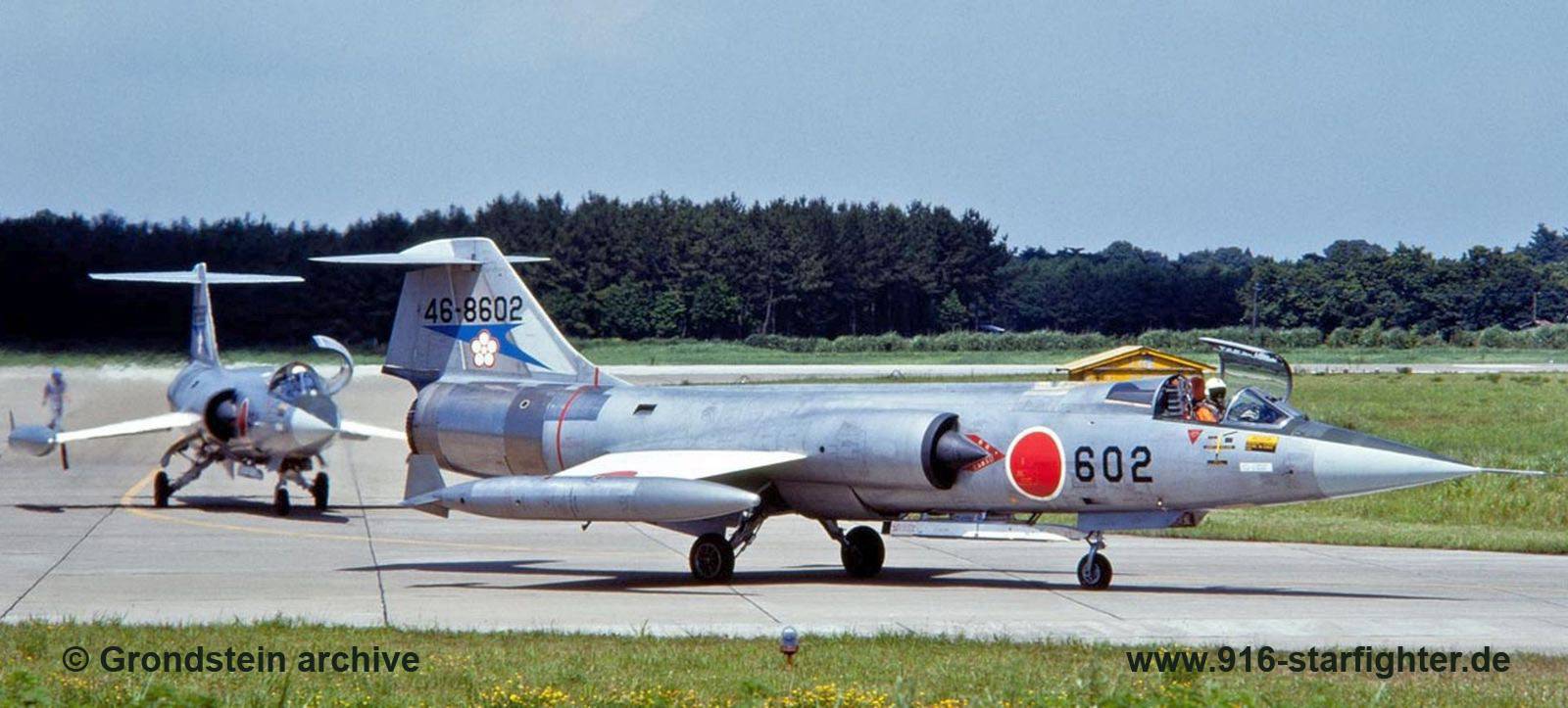F-104J "602", serial number 46-8602, 206 Hikotai in 1973 F-104J, construction number 6803-3102, model 683-07-14, JASDF serial number 46-8602, built by MitsubishiMitsubishi built; August 8, 1964 delivered to JASDF; first unit 202 Hikotai of 5 Wing; next to 206 Hikotai of 7 Wing; in 1980 to 204 Hikotai of 5 wing ACM meeting in autumn 1980 in 3-tone grey camouflage scheme; in April 1983 to 203 Hikotai of 5 Wing, seen with Orange tip tank bands May 30, 1984 withdrawn from use by 203 Hikotai of 2 Wing; preserved as gate guard at Miho AB, Tottori Prefecture with 2 Wing 203 squadron marks in November 1991 at Yonago Apt, Miho AB November 1999 noted, April 20, 2003 noted, October 24, 2005 noted, February 7, 2008 noted; Miho AB, Tottori Prefecture June 2018 noted displayed at Miho Air Base September 2024 in memory display line near the fence noted.