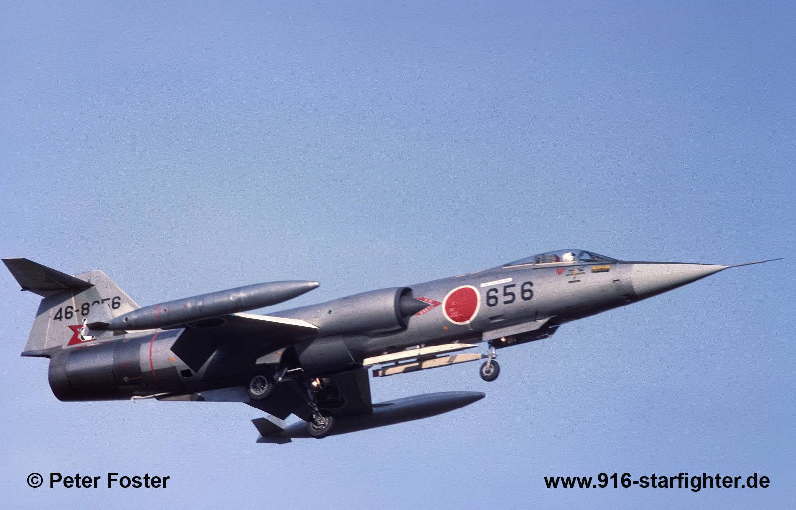 F-104J "656" (46-8656) 203 Hikotai of 2 Kokudan JASDF at Chitose AB in November 1976 construction number 683B-3156, model 683-07-14, JASDF serial number 46-8656, built by MitsubishiMitsubishi built; February 18, 1965 handed over to Air Self-Defense Force; in 1975/76 noted with 204 Hikotai of 5 Kokudan (Wing) at Nyuutabaru AB June 29, 1977 midair collision with the 56-8675, over the East China Sea, 110 km SW of Nagasaki City, during a low-altitude interception mission, crashed into sea both pilots were killed, bodies were not recovered. copyright © Peter Foster