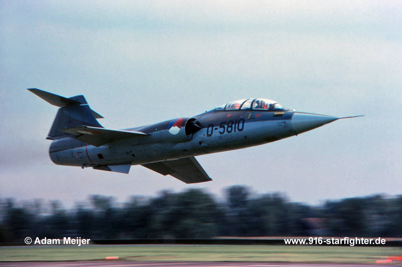 TF-104G "D-5810" CAV (Conversie Afdeling Volkel - conversion all-weather flight) at Volkel October 4, 1978 TF-104G, construction number 583E-5810, model 583-10-20, built by LockheedD-5810 taken on charge November 16, 1963 to CAV (Conversie Afdeling Volkel); 12. till 21.June 1972 exchange with French Air Force EC2-11 flying the F-100 Super Sabre and based at Toul 28 August till 6 September 1974 exchange with Royal Air Force 5 Squadron, based at Binbrook, flying the Lightning; withdrawn from use November 26, 1984 with 3.754 flight hours stored Air Base Ypenburg (EHYB) 1984; stored at Ypenburg AB July 31, 1987, instructional airframe at Hoofddorp Nationale Luchtvaart College 2001 stored Soesterberg Dutch Air Force Museum May 9, 2003 noted; stored Dutch Air Force Museum April 26, 2006 last noted restoration at Wolf Aircraft, Denison, Texas 2011; suspended the refurbishment 02.2012; sold and transported to Steve Alex D-5810 for restoration 20 July 2013 fuel test November 1, 2015 by Steve Alex in Maine, USA; December 19, 2020 D-5810 offered for sale for a buyer with the time and energy to complete the project to get it flyworthy again price is 325.000 US dollars. The TF-104G is nearly 100% complete, with a zero time General Electric J79-11F engine; December 2020 noted. copyright @ Adam Meijer