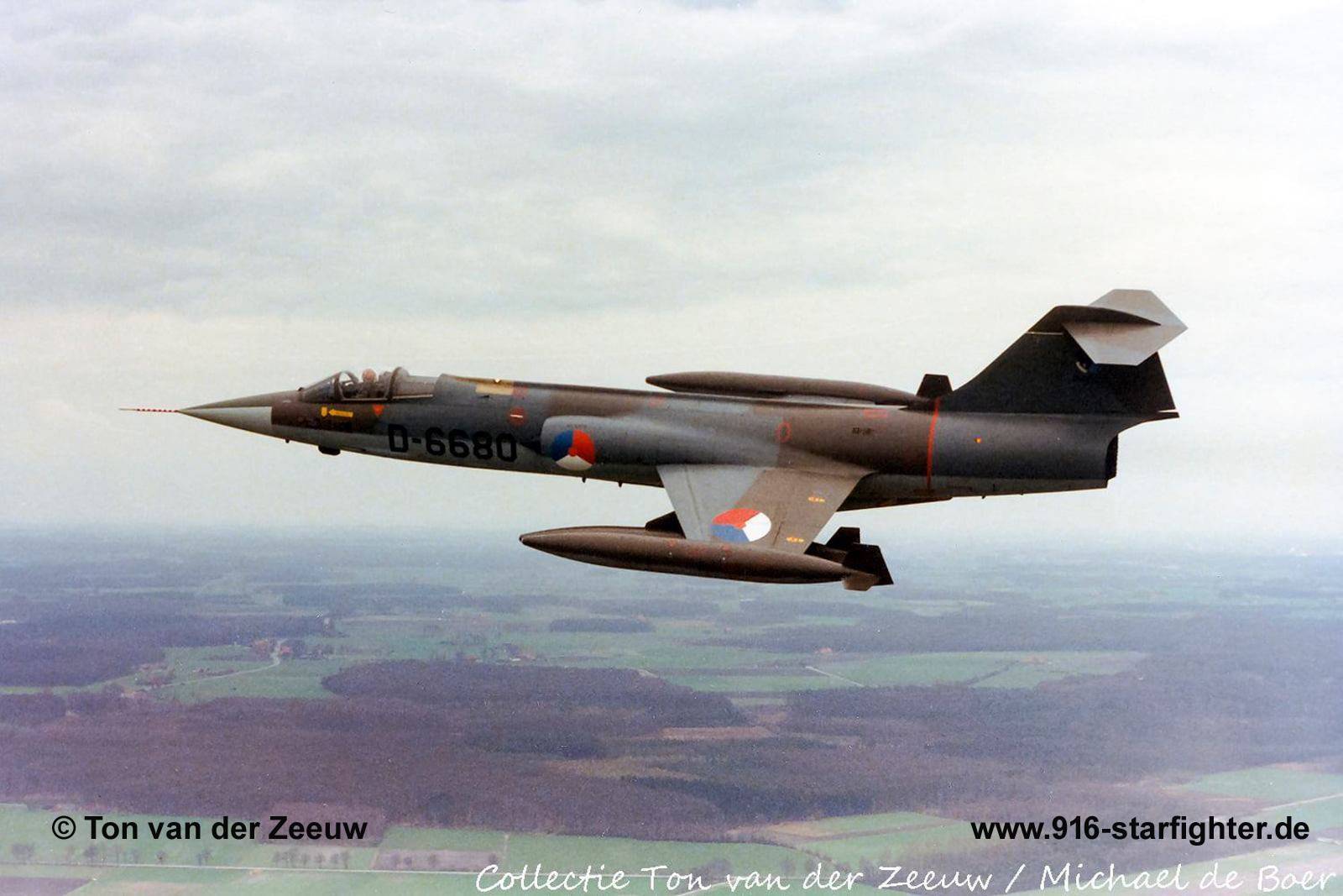 F-104G "D-6680" 311 squadron of RNLAF F-104G, construction number 683D-6680, model 683-10-19, built by FIATD-6680 MAP KLU, May 1965 as FIAT Italy license built aircraft; aircraft left FIAT Torino for Volkel Air Base on June 18, 1965 and arrived at Volkel on June 21, 1965 on October 7, 1965 it was flown to Twenthe Air Base for the Twenthe Dutch Masters training squadron October 9, 1968 it went to Leeuwarden AB to serve 322/323 interceptor squadron pool; on June 18, 1973 it arrived with Fokker industries for repair on its scoop and duct this was finalized on October 24, 1973; on February 3, 1975 it was transferred to Volkel based 311 squadron between March 7, and June 8, 1977 the aircraft was modified to the latest Dutch FB configuration (Avio Diepen) including IFF and ECM and also got 1800 hours maintenance between September 7, 1979 and October 1, 1979 it got an anti-corrosion treatment at Avio Diepen the aircraft was officially handed over back to the USA (Military Assistance Program contract) where it was decided to transfer it to the Hellenic Air Force it was delivered to the Hellenic Air Force with J79 engine nr 414-277