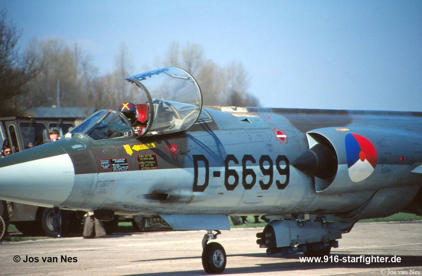 F-104G "D-6699" 312 Squadron RNLAF at Volkel AB in April 1982 F-104G, construction number 683D-6699, model 683-10-19, built by FIATMM6699 RNLAF MAP (Military Assistance Program) taken on charge February 7, 1966, 312 squadron March 3, 1966 September 1975 squadron exchange between 312 Squadron from Volkel and Italian Air Force 10 Gruppo based at Grazzanise flying the F-104S August 1978 squadron exchange between 312 Squadron and USAFE 494 TFS/48 TFW based at Lakenheath, flying the F-111F Fighterbomber aircraft May 1981 squadron exchange between Italian Air Force 23 Gruppo from Rimini, flying the F-104S, with 312 Squadron at Volkel AB