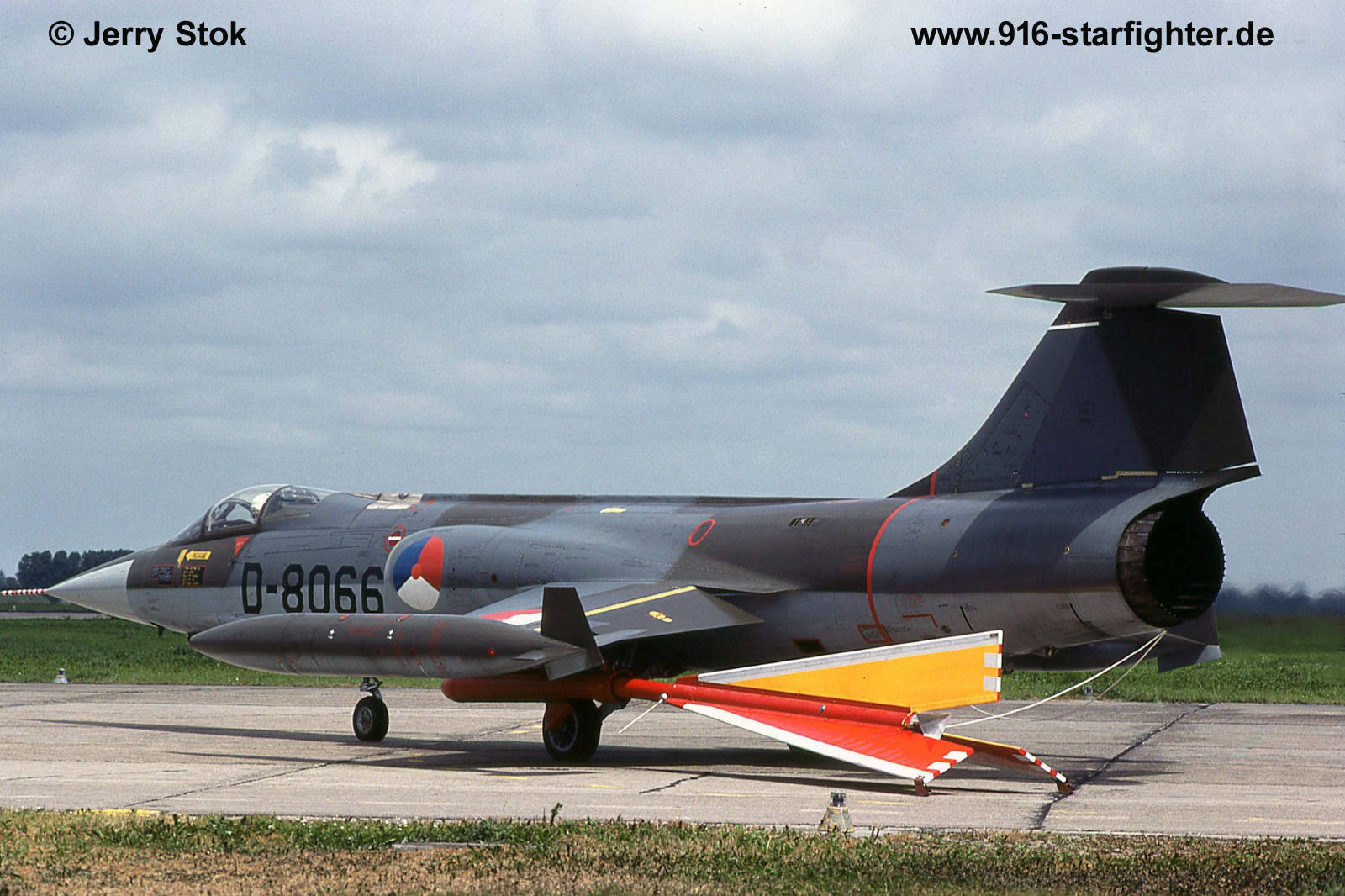 F-104G "D-8066" Dart Towing Squadron at Leeuwarden AB, Netherlands in July 1982 F-104G, construction number 683D-8066, model 683-10-19, built by Fokkermanufactured by North Group (ARGE-Nord); Fokker factory construction number 10516; assembly start December 7, 1962; first flight April 8, 1963 taken on charge July 4, 1963 coded D-8066 by 306 squadron at Twenthe AB; to 322 squadron at Leeuwarden AB September 7, 1964; converted to RF-104G at Avio Diepen April 30, 1965 to 306 squadron August 30, 1965; RF-104G (O) with Orpheus recce pod in 1965 August 1972 exchange between the German Navy MFG 1 based at Schleswig Jagel and the Dutch Air Force 306 Squadron based at Volkel Air Base June 1981 squadron exchange between the Dutch Air Force 306 Squadron from Volkel AB flying the RF-104G with USAFE squadron 1 TRS/10 TRW, based at Alconbury AB Target Towing Squadron (TTS) at Leeuwarden July-September 1982; April 1983 306 Squadron based at Volkel AB with German Air Force 1.Staffel JaboG 32 based at Lechfeld AB, flying the F-104G withdrawn from use November 30, 1983