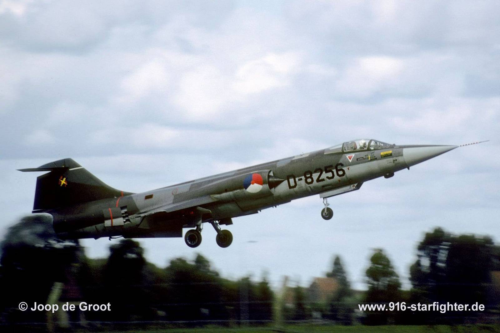 F-104G "D-8256" 312 squadron RNLAF landing in clean configuration in July 1983 F-104G, construction number 683D-8256, model 683-10-19, built by FokkerFokker factory construction number 10706, D-8256 taken on charge August 22, 1964 with 311 squadron September 1974 squadron exchange of Dutch Air Force 312 Squadron, based at Volkel AB and the Royal Air Force 5 Squadron, based at Binbrook, flying the Lightning April 1981 311 Squadron from Volkel AB exchanged with the Italian Air Force 155 Gruppo, based at Istrana, flying the F-104S; July 1983 to TTS at Leeuwarden withdrawn from use at Deelen AB on April 4, 1984; preserved Schaarsbergen, Oranje Kazerne 1993, storage Volkel AB 1999, inside hangar cut in several parts in 2006 to be scrapped in 2010; however they retained the cockpit section and decided to use it for demonstration purposes, like for example during the Dutch Air Force open house in 2007 in 2014 the cockpit was prepared for permanent display inside the Volkel Air Base traditionroom "De Typhoon"; September 2018 noted (mobile); June 2024 noted.